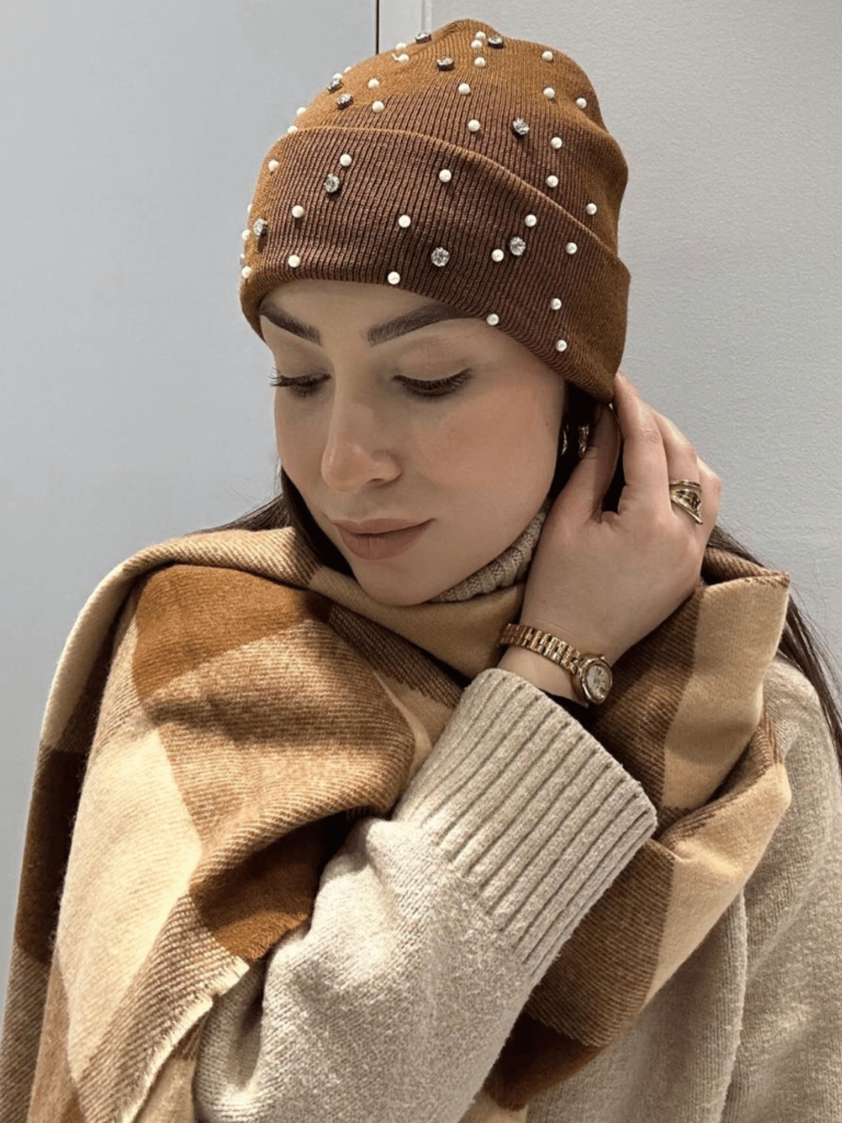 Γυναικείο Μονόχρωμο Σκουφάκι με Πέρλες-Καφέ
