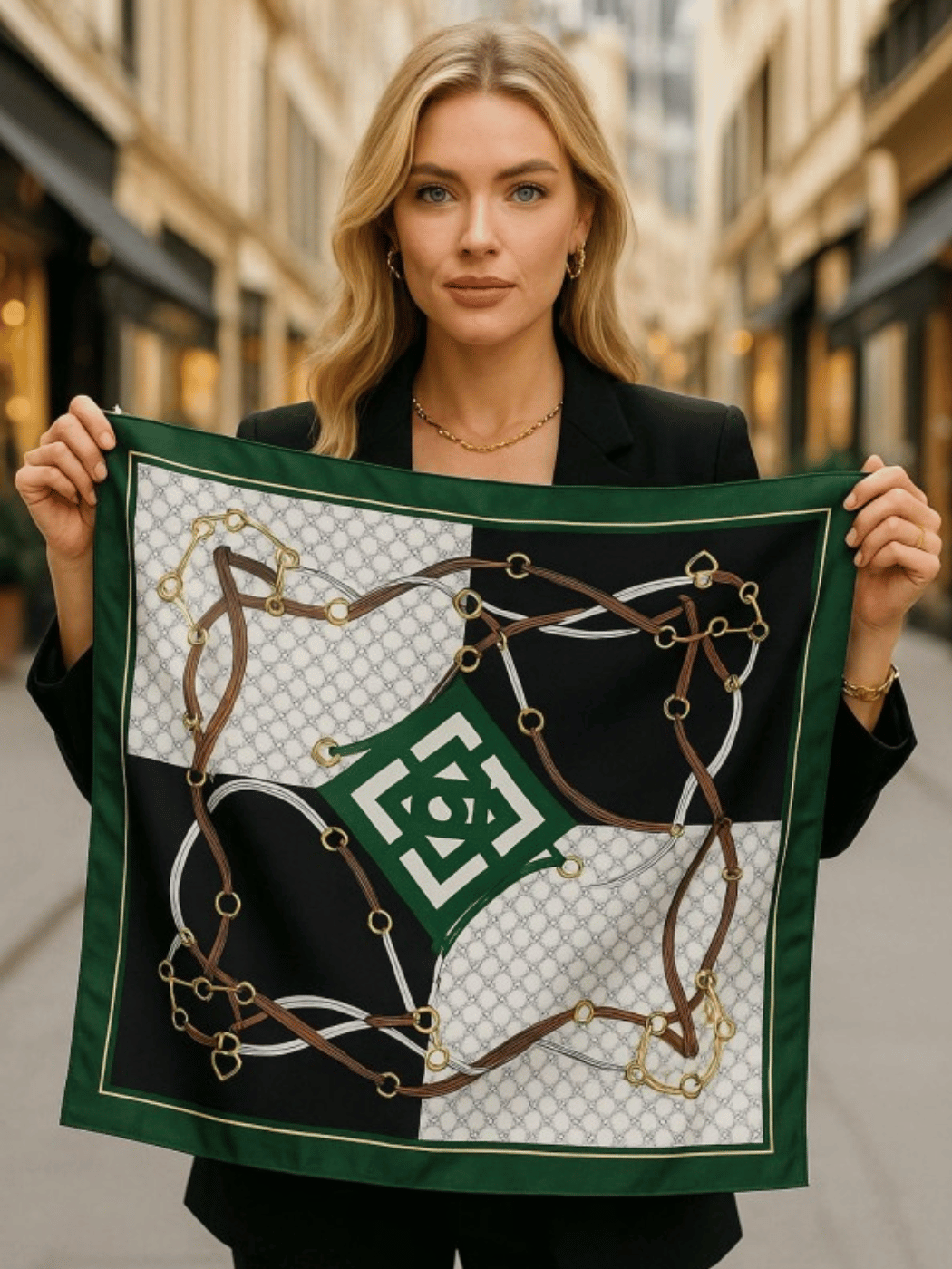 Ανανεώστε το στυλ σας με αυτό το κομψό φουλάρι bandana σε πράσινες αποχρώσεις, που συνδυάζει μοναδικά το αλυσιδωτό σχέδιο με το καρό μοτίβο. Ένα εκλεπτυσμένο και ταυτόχρονα μοντέρνο αξεσουάρ που ολοκληρώνει κάθε σας εμφάνιση με φινέτσα και χαρακτήρα.
