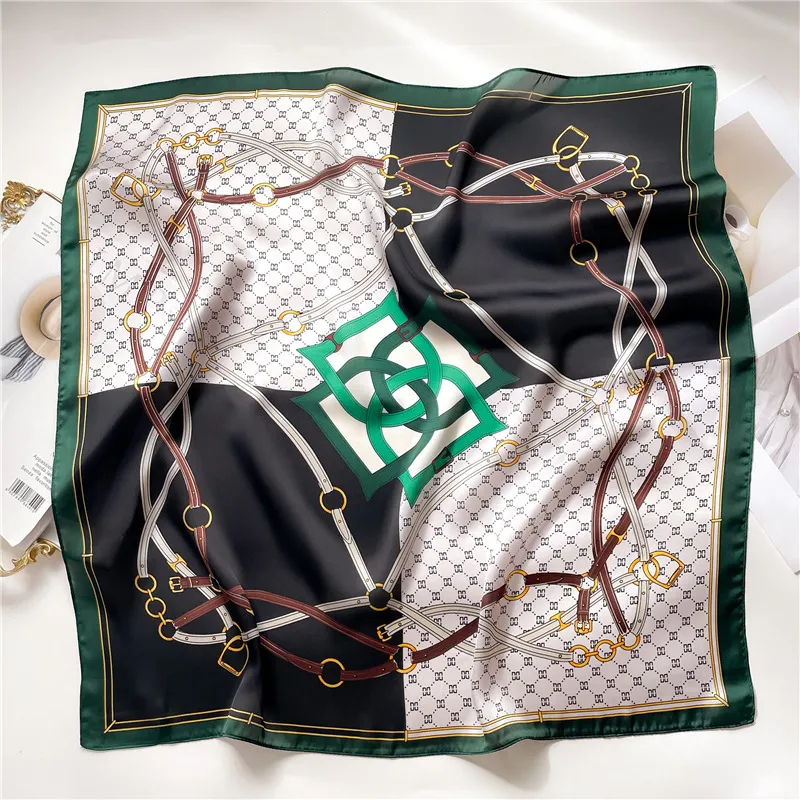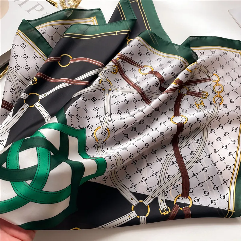 Το πράσινο περίγραμμα προσθέτει ένταση και αντίθεση στο σχέδιο, αναδεικνύοντας τα διακοσμητικά μοτίβα. Κατασκευασμένο από 100% πολυεστέρα υψηλής ποιότητας, το μαντήλι είναι απαλό, ελαφρύ και ανθεκτικό, ιδανικό για κάθε εποχή του χρόνου.