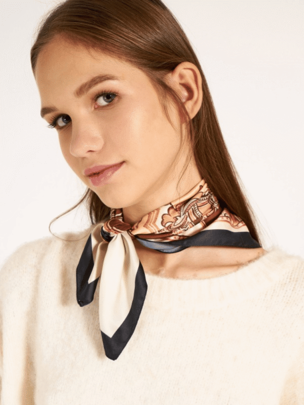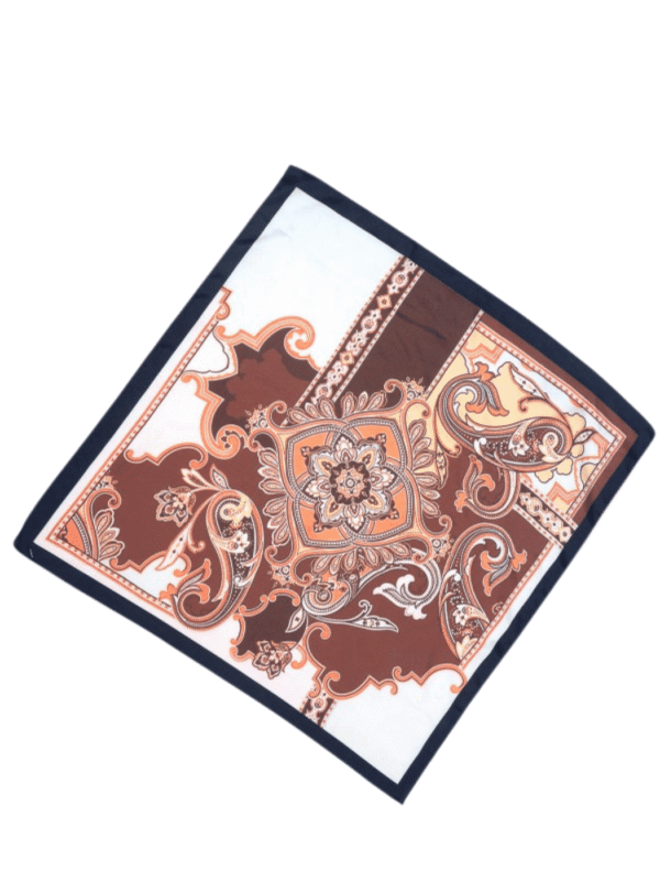 Με διαστάσεις 70×70 cm, μπορείτε να το φορέσετε με πολλούς τρόπους — γύρω από τον λαιμό, στα μαλλιά, ως κορδέλα ή ακόμη και στην τσάντα σας για μια μοντέρνα πινελιά. Η διπλής όψης εκτύπωσή του σάς επιτρέπει να δημιουργείτε διαφορετικά looks ανάλογα με τη διάθεσή σας.
