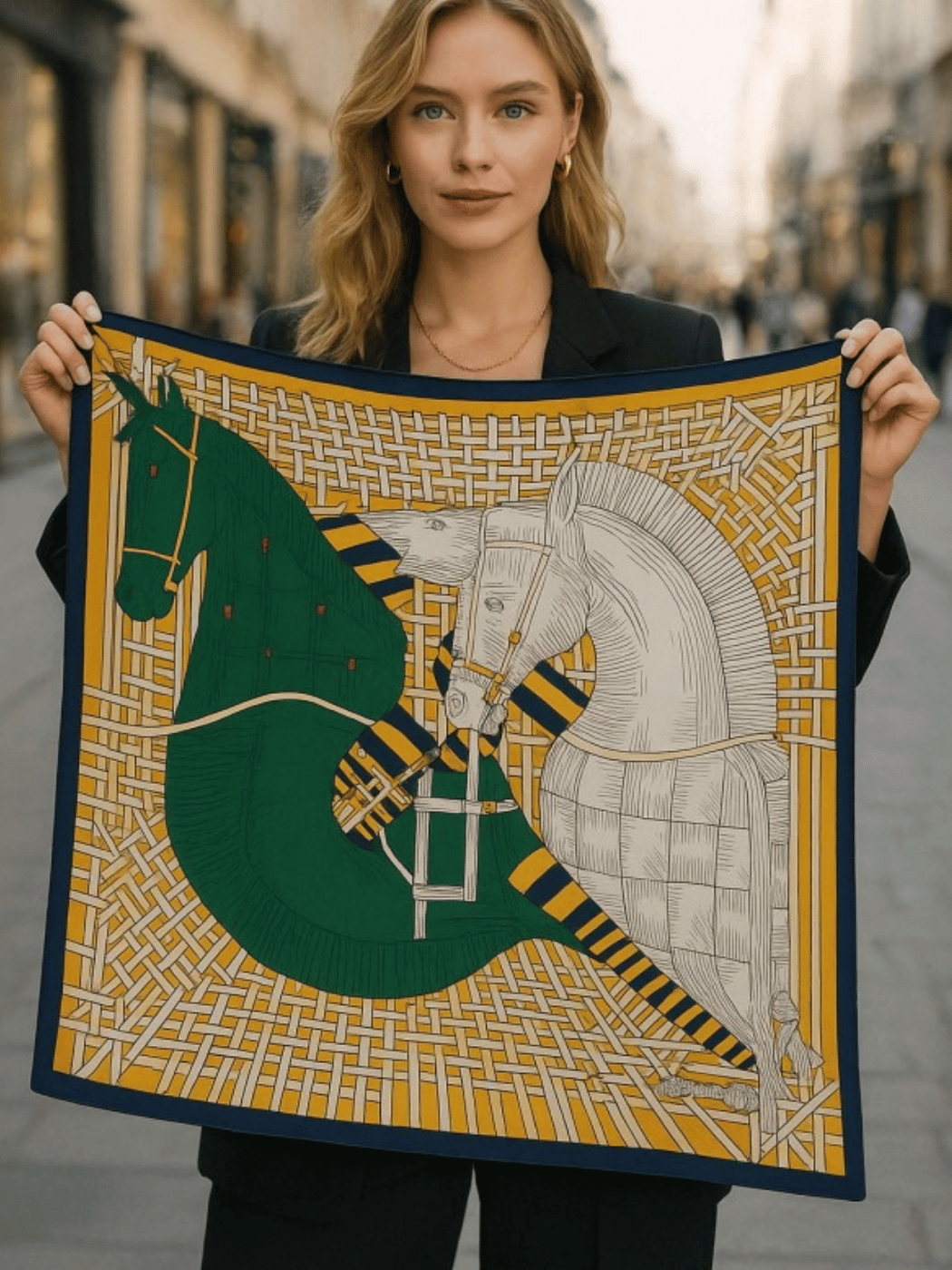 Αναδείξτε το στυλ σας με αυτό το πράσινο φουλάρι / μπαντάνα διπλής όψης 90×90 cm με όμορφο σχέδιο αλόγου. Το απαλό και λαμπερό ύφασμα σατέν αγκαλιάζει το δέρμα, προσφέροντας άνεση και κομψότητα. Ιδανικό για να φορεθεί γύρω από τον λαιμό, στα μαλλιά ή ακόμα και ως statement αξεσουάρ στη τσάντα σας, για ένα look που ξεχωρίζει με στυλ και φινέτσα.