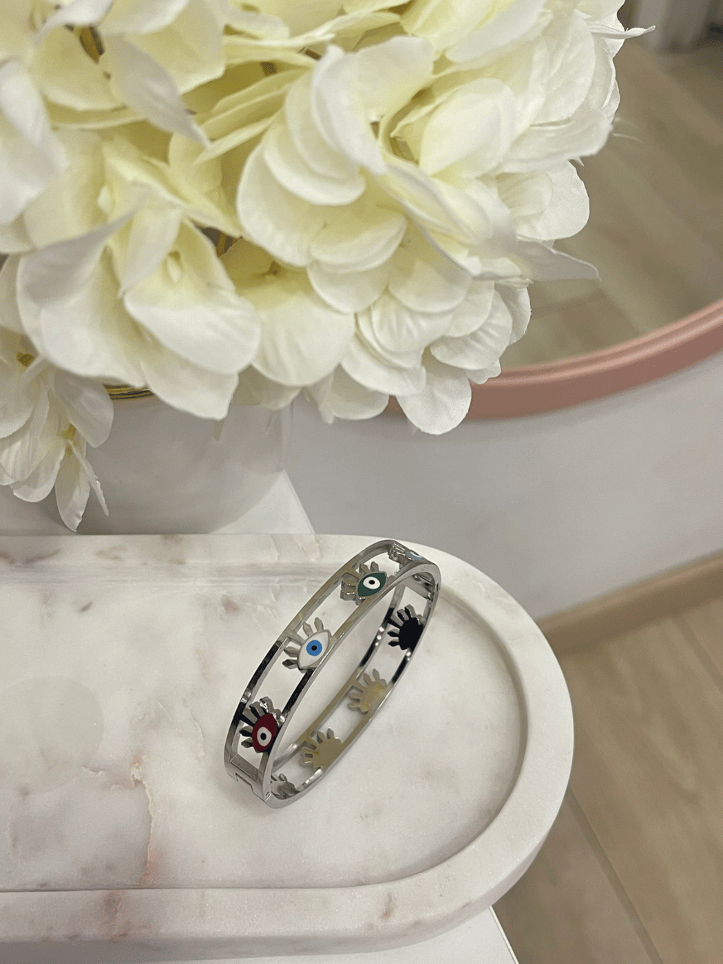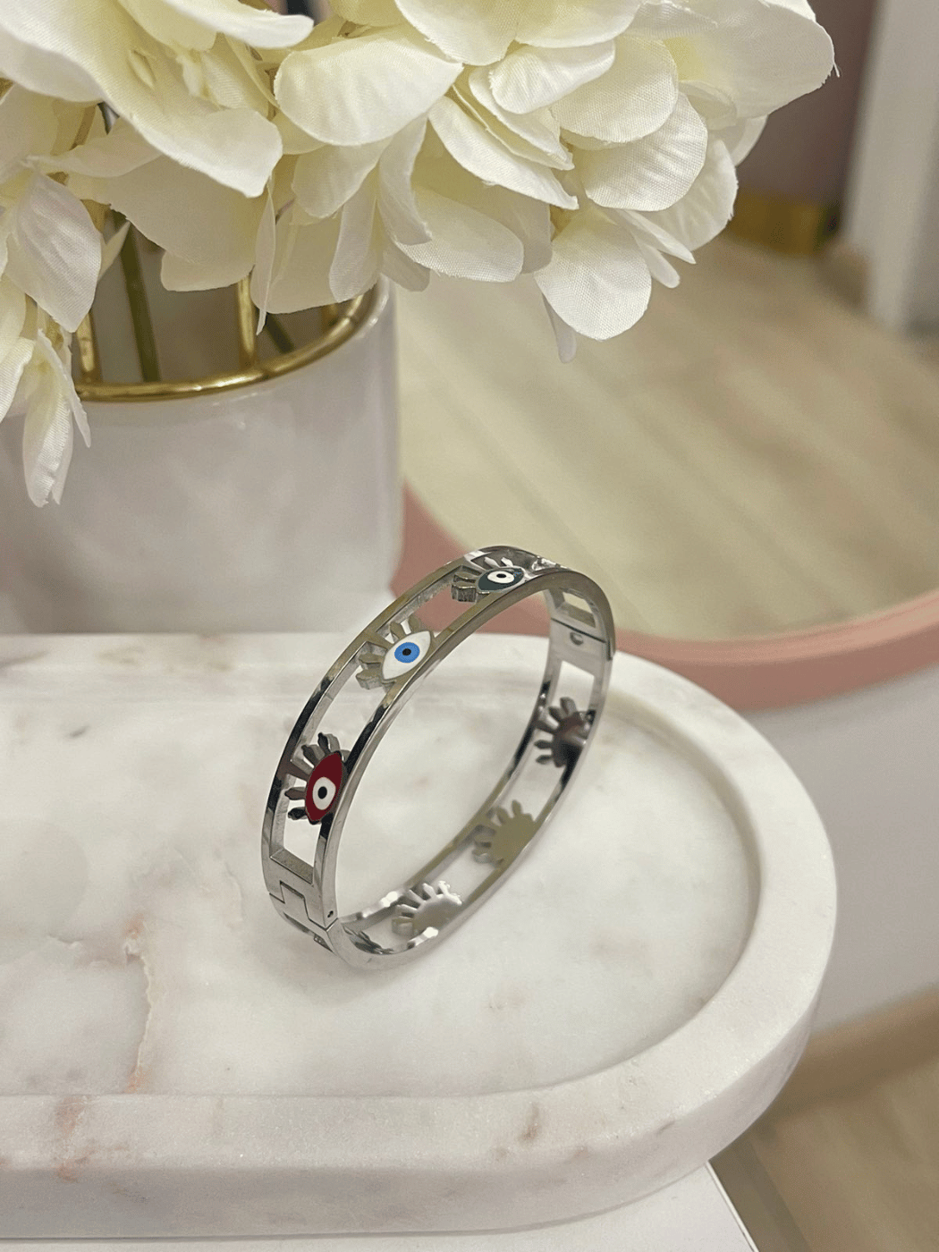 Γυναικεία Ατσάλινη Χειροπέδα με πολύχρωμα ματάκια σε ασημί και χρυσό χρώμα. Ένα υπέροχο κόσμημα για όλες τις ώρες της ημέρας!