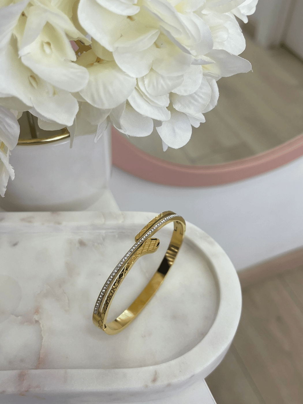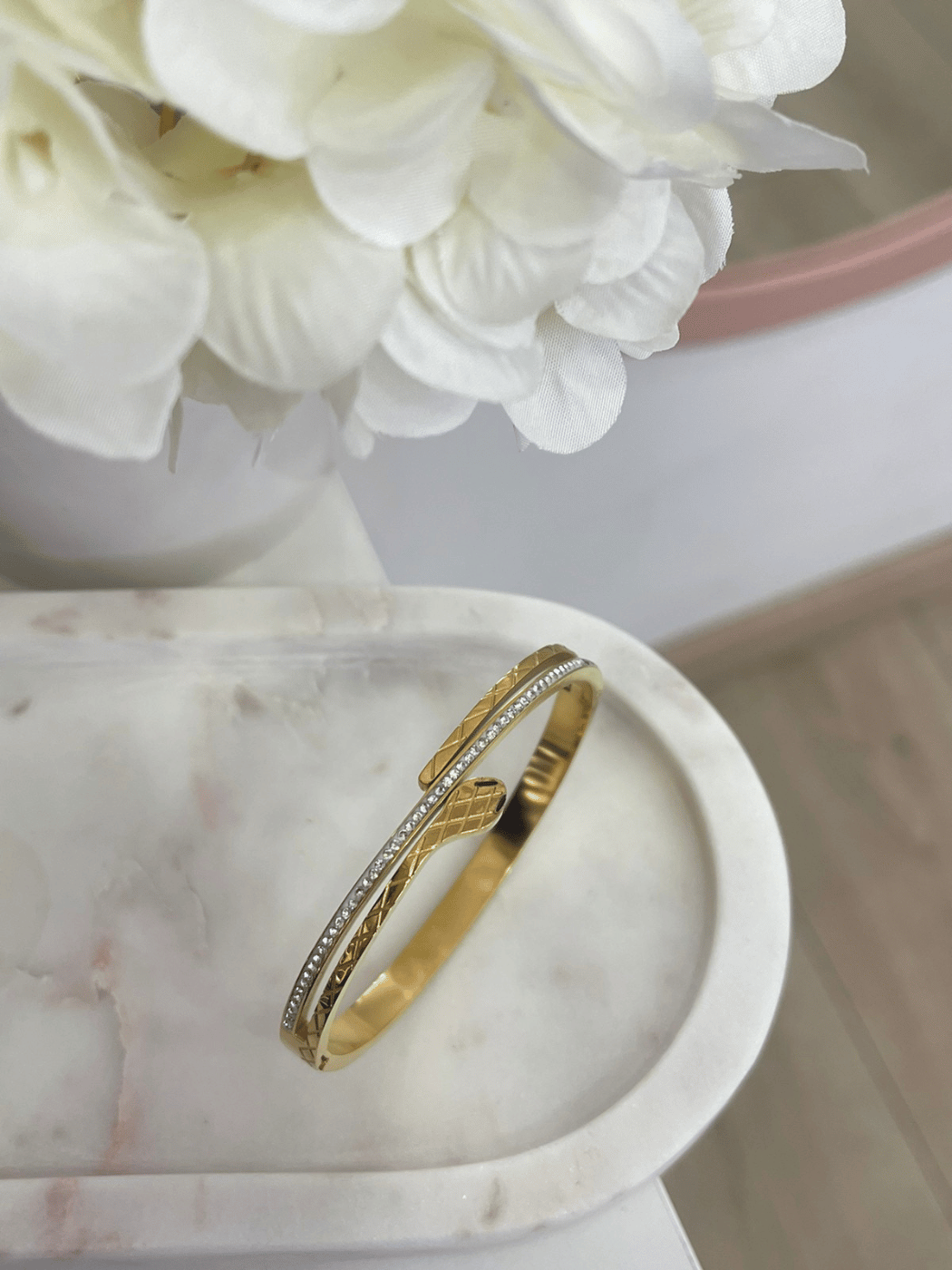 Κομψή ατσάλινη χειροπέδα σε χρυσό τόνο με ιδιαίτερο ανάγλυφο μοτίβο και διακριτική σειρά από λαμπερές πέτρες. Ο συνδυασμός υφής και λάμψης δημιουργεί ένα μοντέρνο αλλά διαχρονικό αποτέλεσμα που ξεχωρίζει.