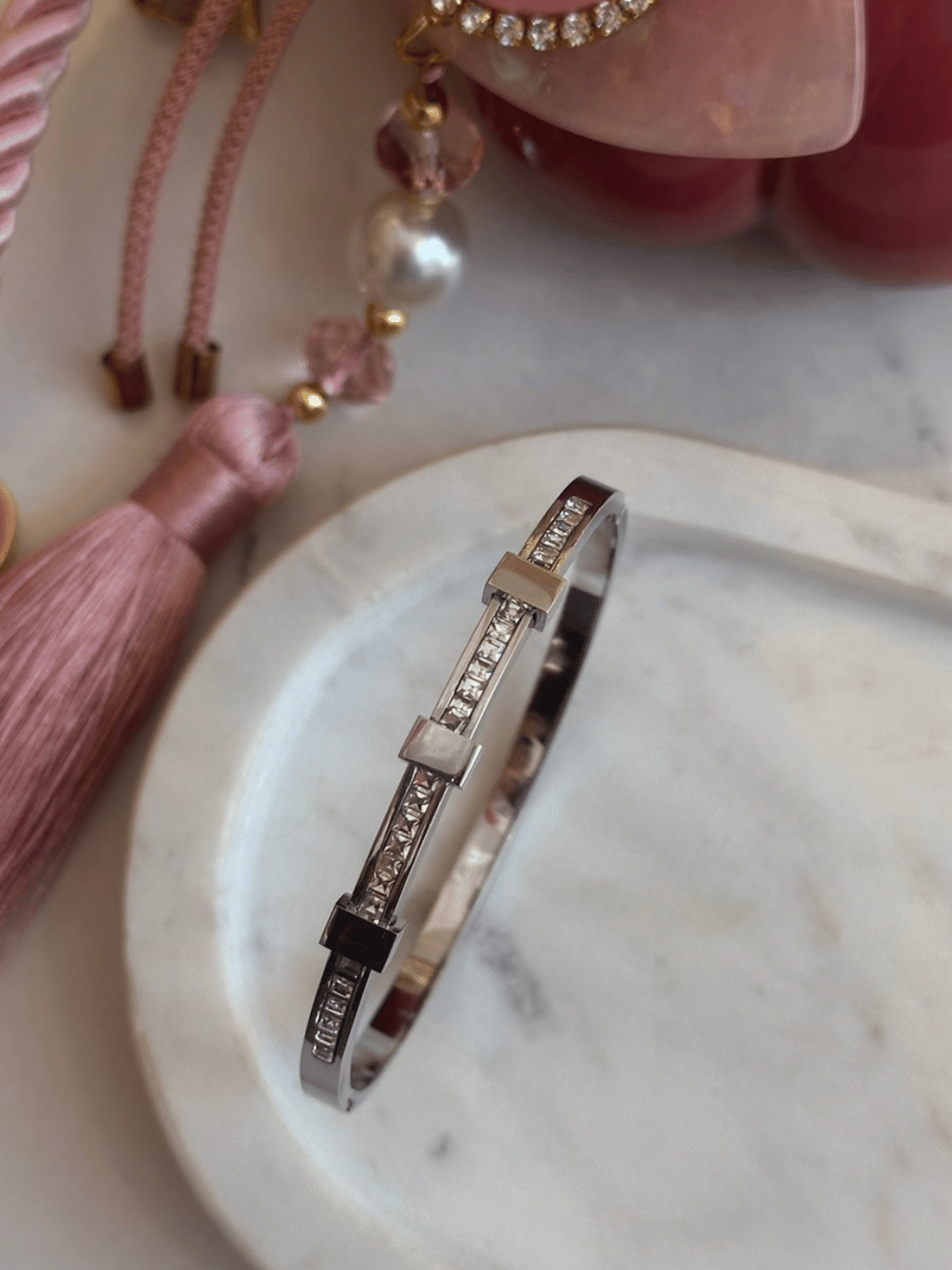 Κομψή ατσάλινη χειροπέδα σε λαμπερό χρυσό τόνο με μοντέρνο γεωμετρικό μοτίβο και ενσωματωμένες λαμπερές πέτρες που χαρίζουν διακριτική πολυτέλεια. Το ιδιαίτερο σχέδιό της την κάνει ιδανική για statement εμφανίσεις αλλά και για κομψό καθημερινό στυλ.