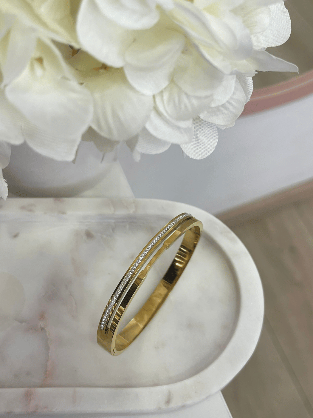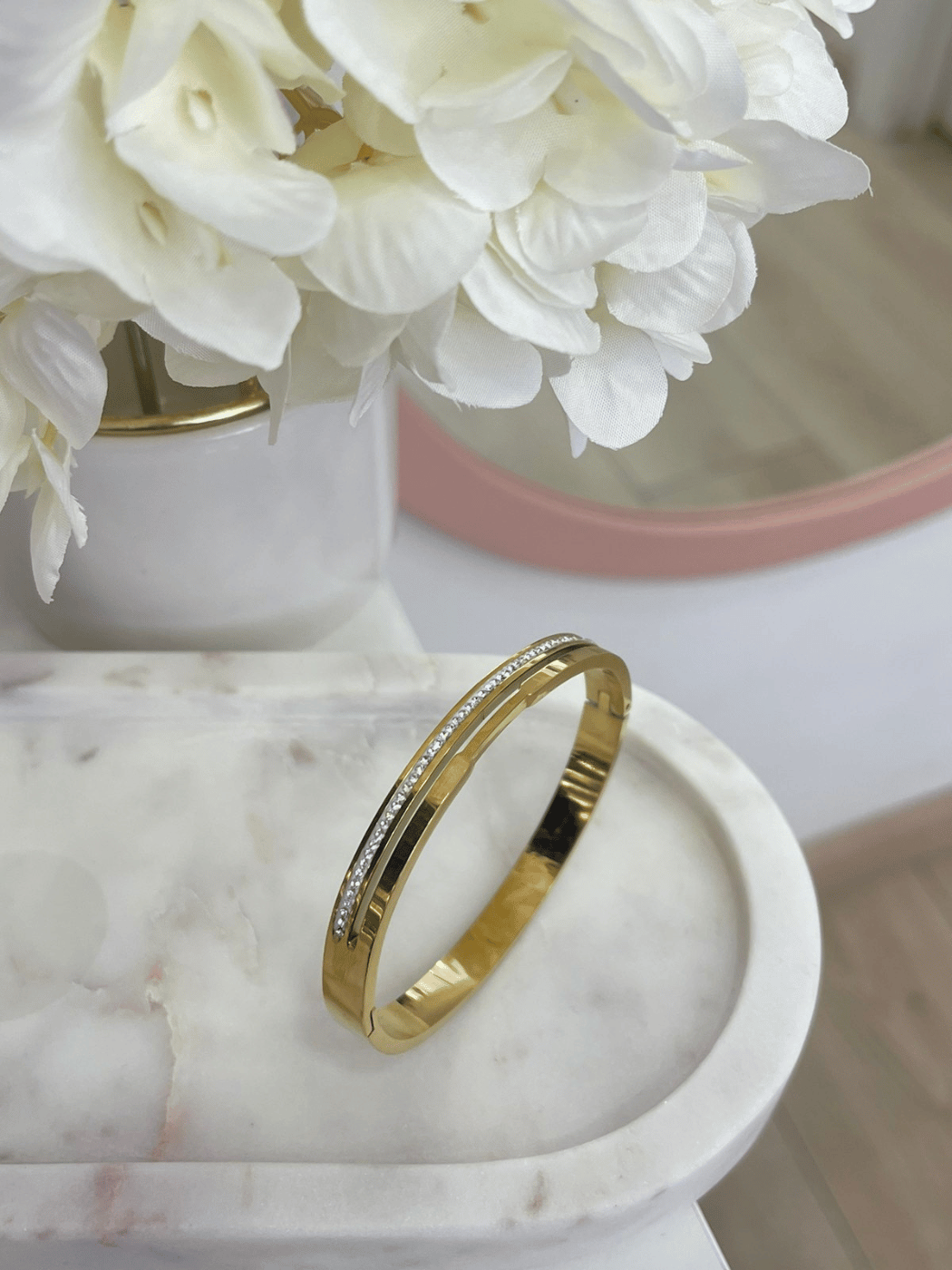 Minimal και κομψή ατσάλινη χειροπέδα σε λαμπερό χρυσό τόνο, διακοσμημένη με μία διακριτική σειρά από λαμπερές πέτρες που χαρίζουν εκλεπτυσμένη λάμψη. Το λεπτό και διαχρονικό της σχέδιο την κάνει ιδανική για καθημερινή χρήση αλλά και για πιο elegant εμφανίσεις.