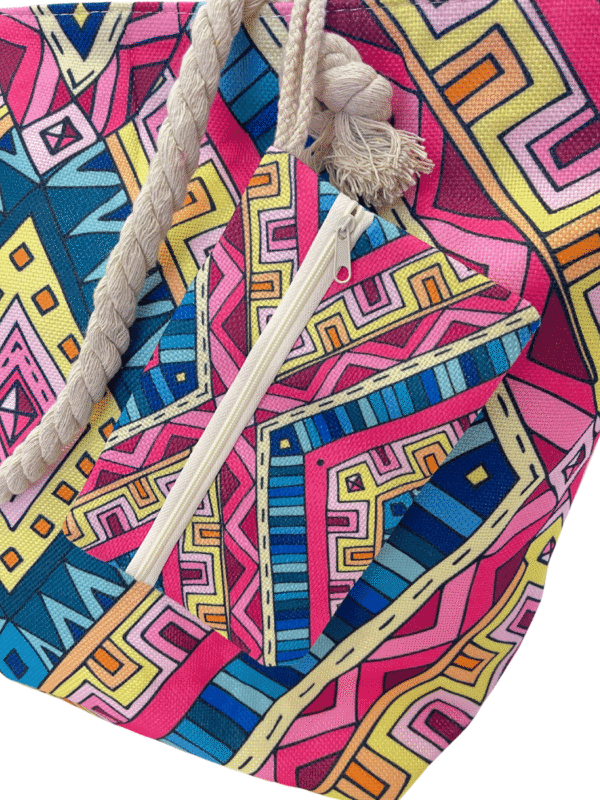 Γυναικεία τσάντα θαλάσσης με σχέδιο μάτι σε ανοιχτό μπλε χρώμα. Διαθέτει μεγάλη χωρητικότητα και χερούλια ώμου. Κλείνει εσωτερικά με φερμουάρ. Περιλαμβάνει έξτρα μίνι τσαντάκι με φερμουάρ.
