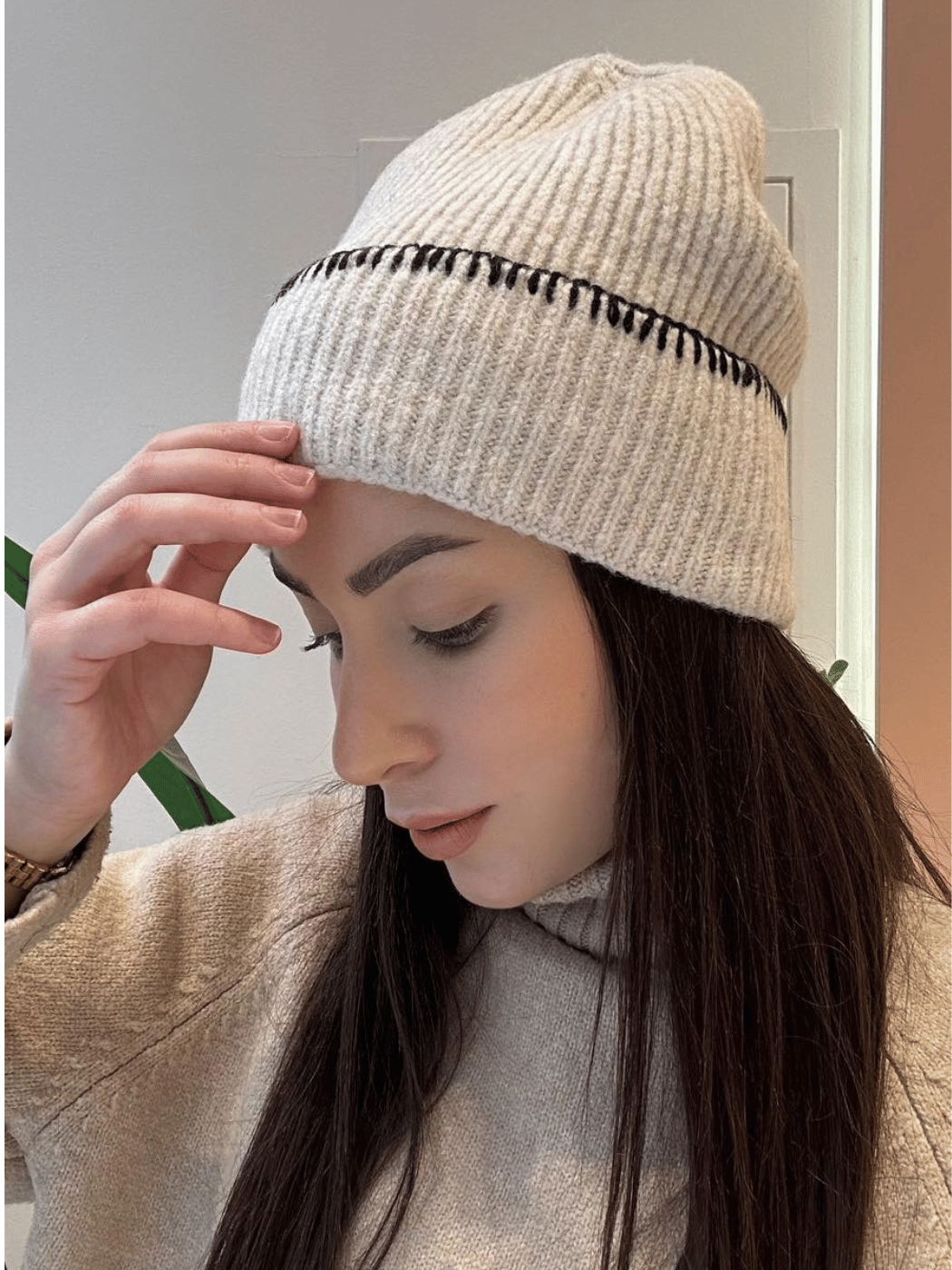 Εκρού μονόχρωμο σκουφάκι με μαύρη ραφή, σε άνετο one size. Μαλακό, ζεστό και ιδανικό για καθημερινή χρήση τον χειμώνα.