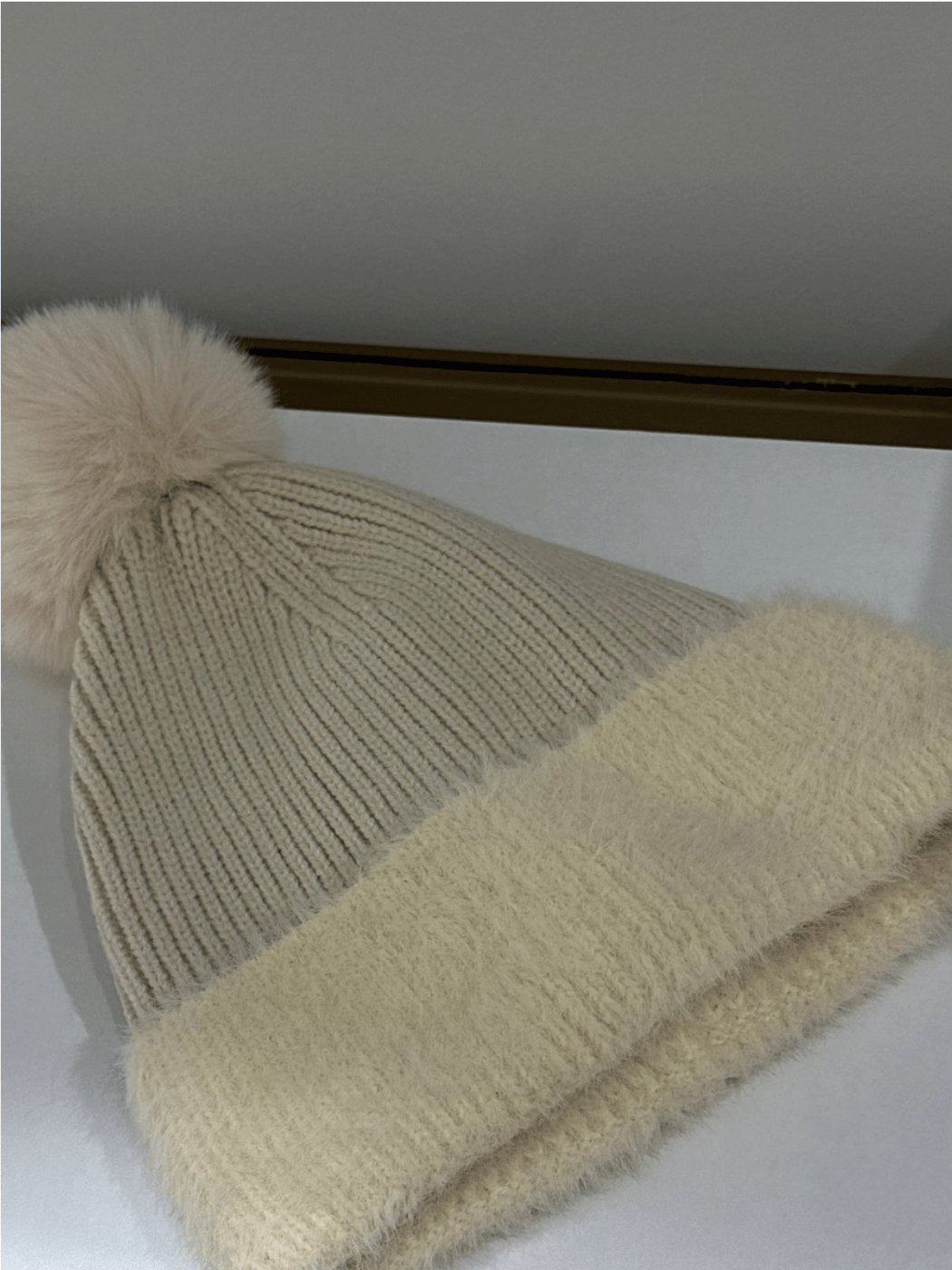 Γυναικείο Σκουφάκι με Φούντα και Χνουδωτή Λεπτομέρεια-Εκρού