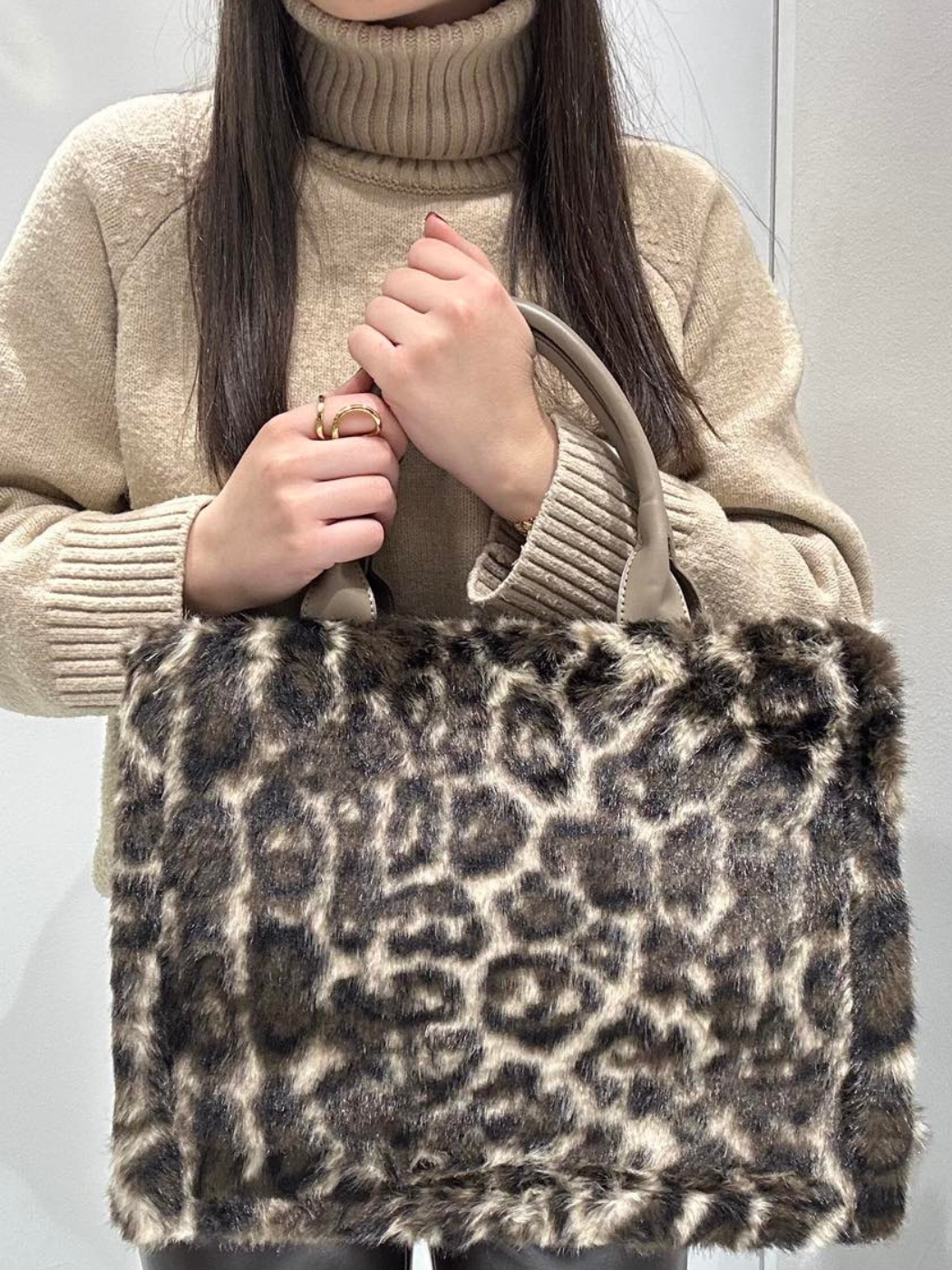 Τετράγωνη tote bag με εντυπωσιακό leopard pattern. Εξαιρετικά μαλακή faux γούνα υψηλής ποιότητας. Σταθερές χειρολαβές σε καφέ δερματίνη για άνεση και στυλ. Ιδανική για το γραφείο, τις βόλτες στην πόλη ή μια βραδινή έξοδο.