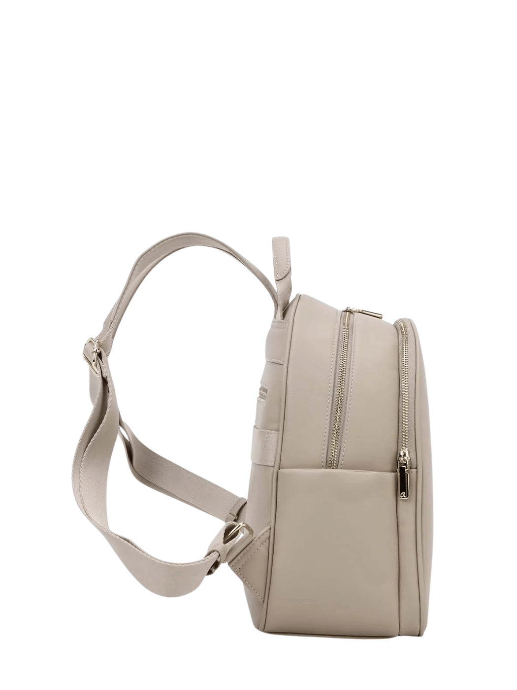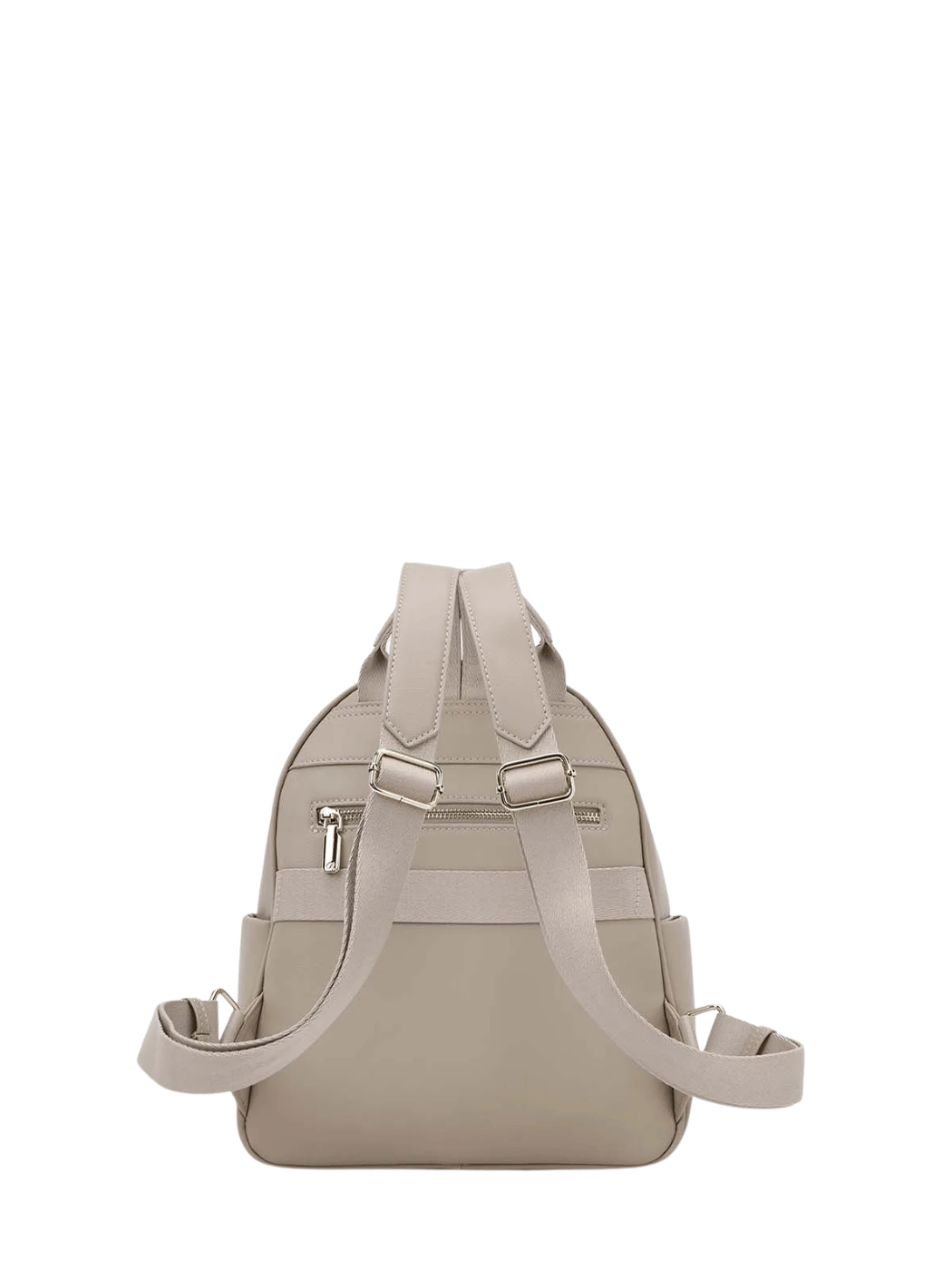Γυναικείο σακίδιο πλάτης, με πλαϊνές τσέπες, από τεχνόδερμα υψηλής ποιότητας. Έχει δύο κεντρικές θέσεις, οι οποίες είναι φοδραρισμένες. Με εσωτερικές θήκες και τσέπη που κλείνει. Διαθέτει πίσω τσέπη. Κλείνει με διπλό φερμουάρ, έχει ιμάντα στερέωσης για βαλίτσα και ρυθμιζόμενους ιμάντες πλάτης.