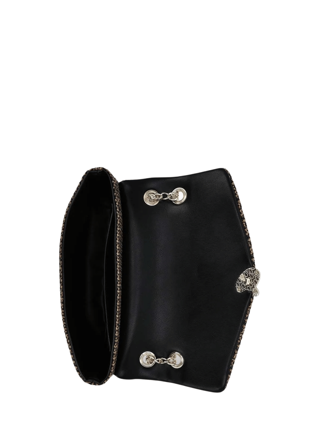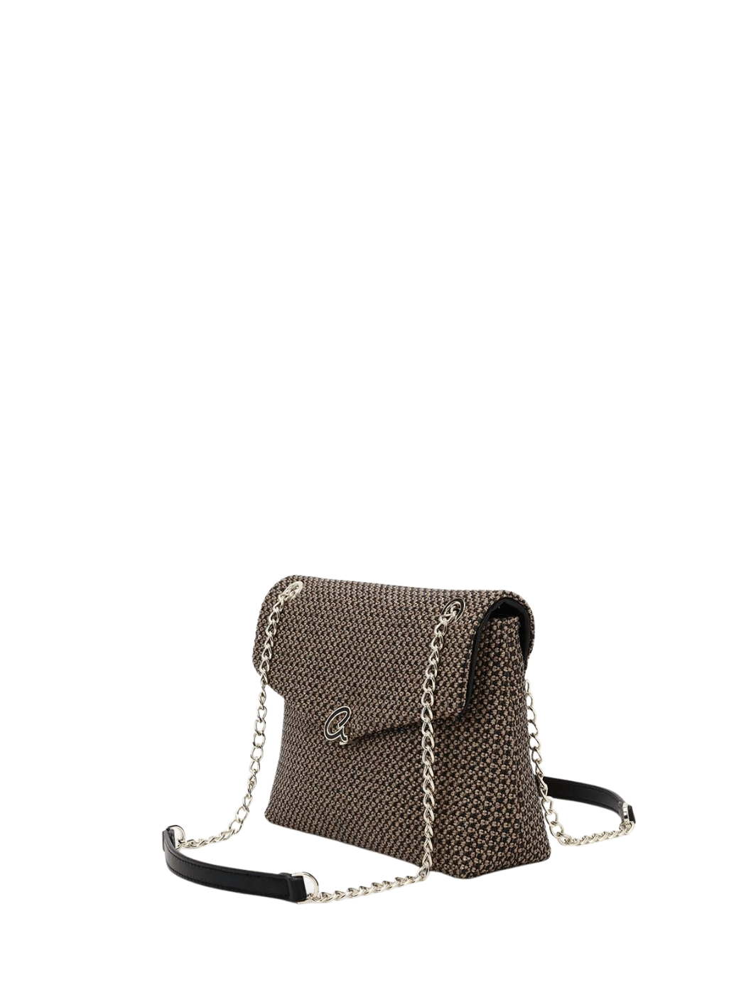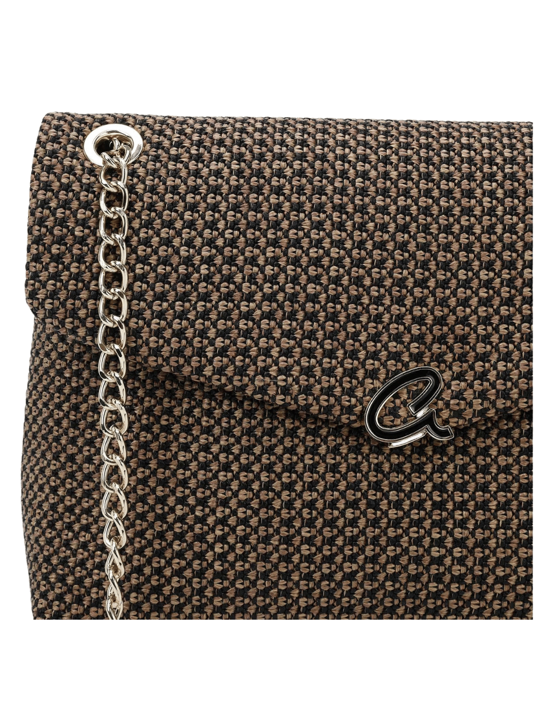 Γυναικεία τσάντα ώμου με διπλή αλυσίδα και από όψη ψάθας με συνδυασμό τεχνοδέρματος. Περιέχει εσωτερική τσέπη και κλείνει με καπάκι και κούμπωμα. Μια υπέροχη επιλογή για τις βόλτες σας.