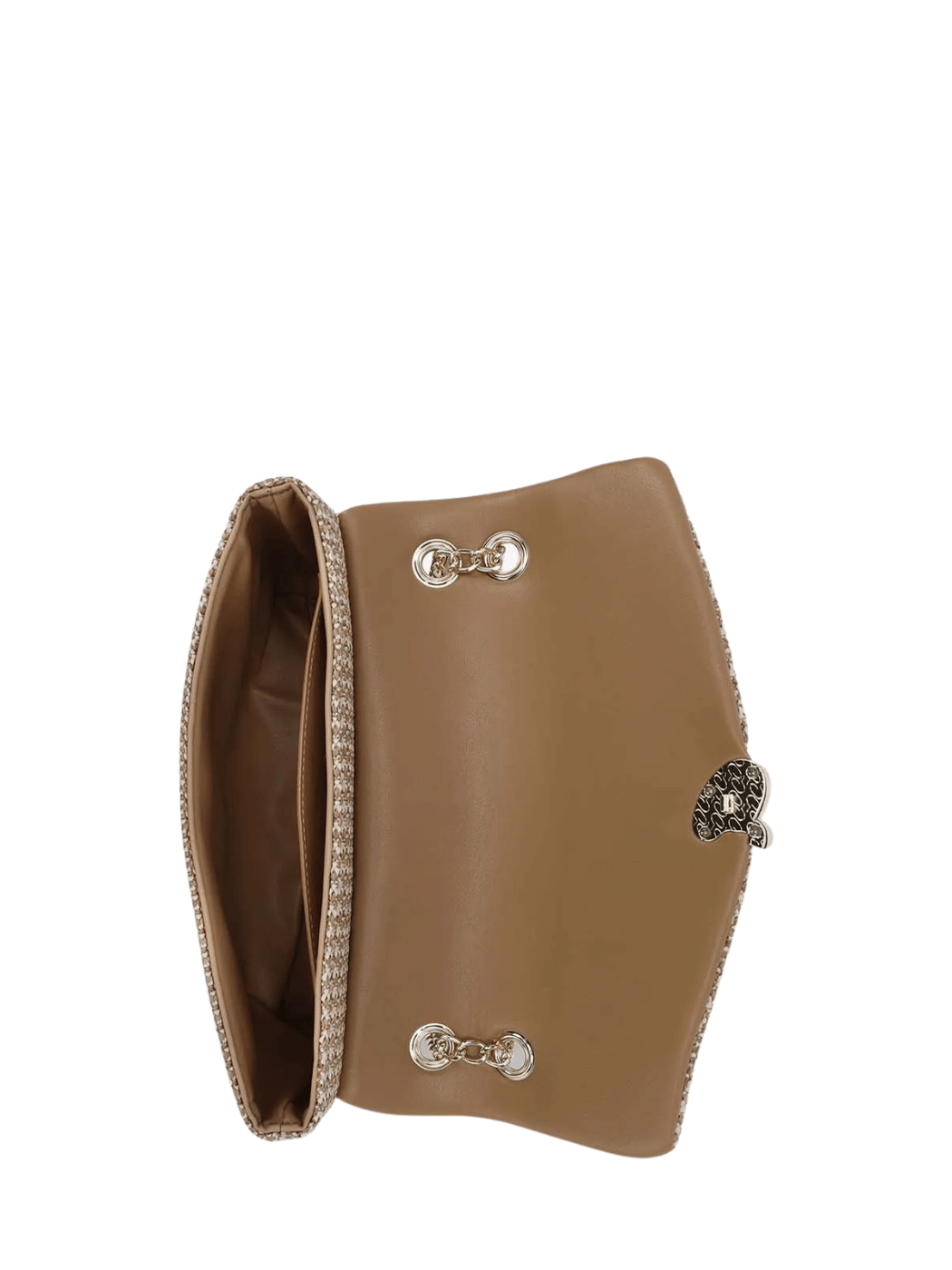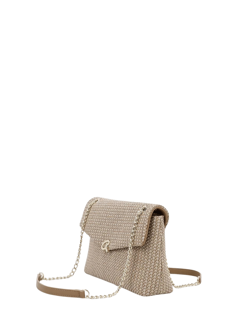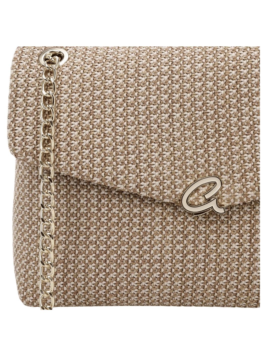 Γυναικεία τσάντα ώμου με διπλή αλυσίδα και από όψη ψάθας με συνδυασμό τεχνοδέρματος. Περιέχει εσωτερική τσέπη και κλείνει με καπάκι και κούμπωμα. Μια υπέροχη επιλογή για τις βόλτες σας.