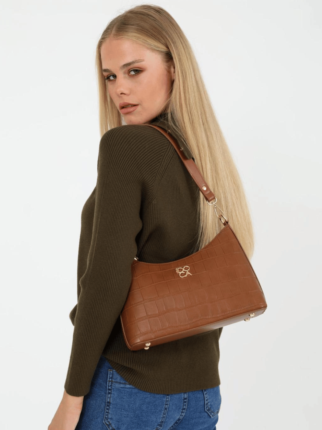 Γυναικεία μικρή τσάντα ώμου σε μαύρο χρώμα με αποσπώμενο λουράκι, εξωτερική τσέπη και κροκό υφή. Κατασκευασμένη από συνθετικό δέρμα.