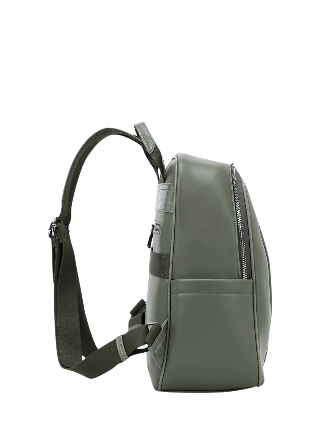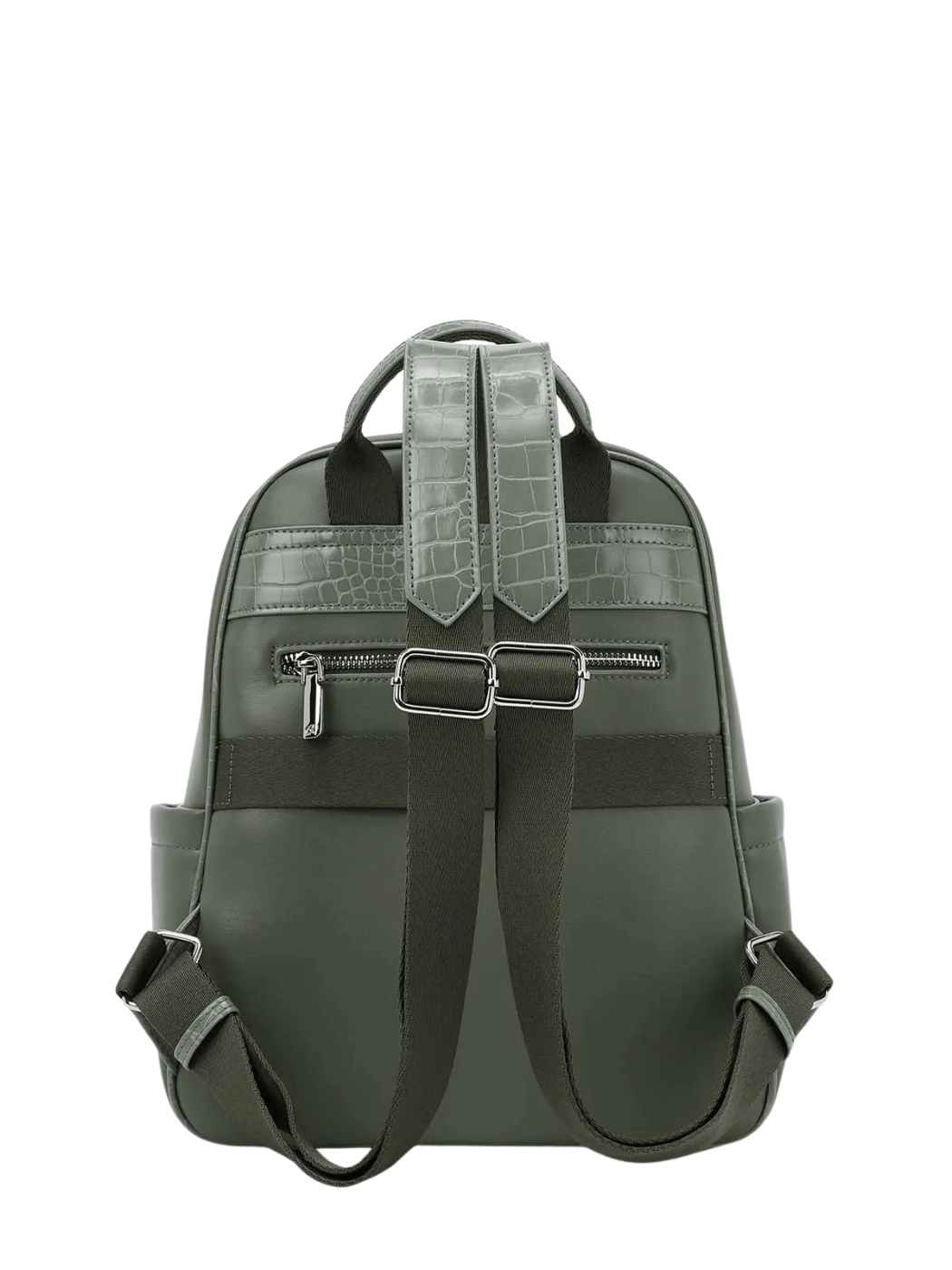 Γυναικείο σακίδιο πλάτης από υψηλής ποιότητας συνθετικό δέρμα. Διαθέτει κροκό διακοσμητικές λεπτομέρειες, χειρολαβή, ρυθμιζόμενους ιμάντες πλάτης και ιμάντα στερέωσης για βαλίτσα, μια πρακτική προσθήκη που θα βοηθάει στα στα ταξίδια σας. Εσωτερικά περιέχει θήκες, τσέπη με φερμουάρ και είναι επενδυμένο με φόδρα. Εξωτερικά διαθέτει πλαϊνές τσέπες μπροστινές και πίσω θήκες που κλείνουν με φερμουάρ. Κλείσιμο με διπλό φερμουάρ.