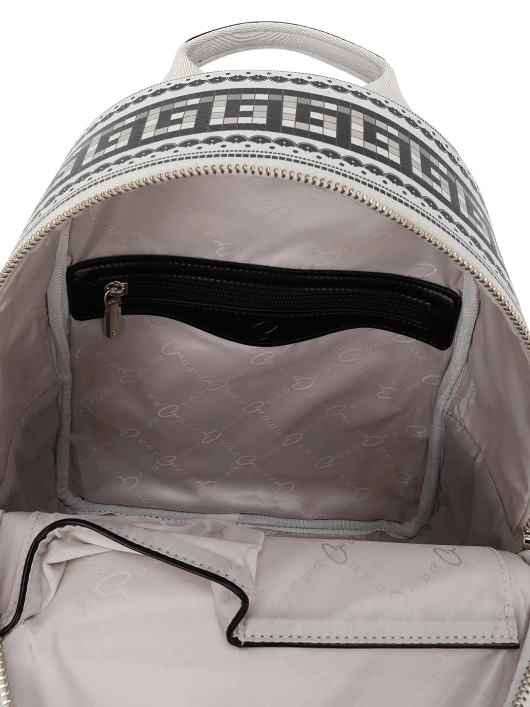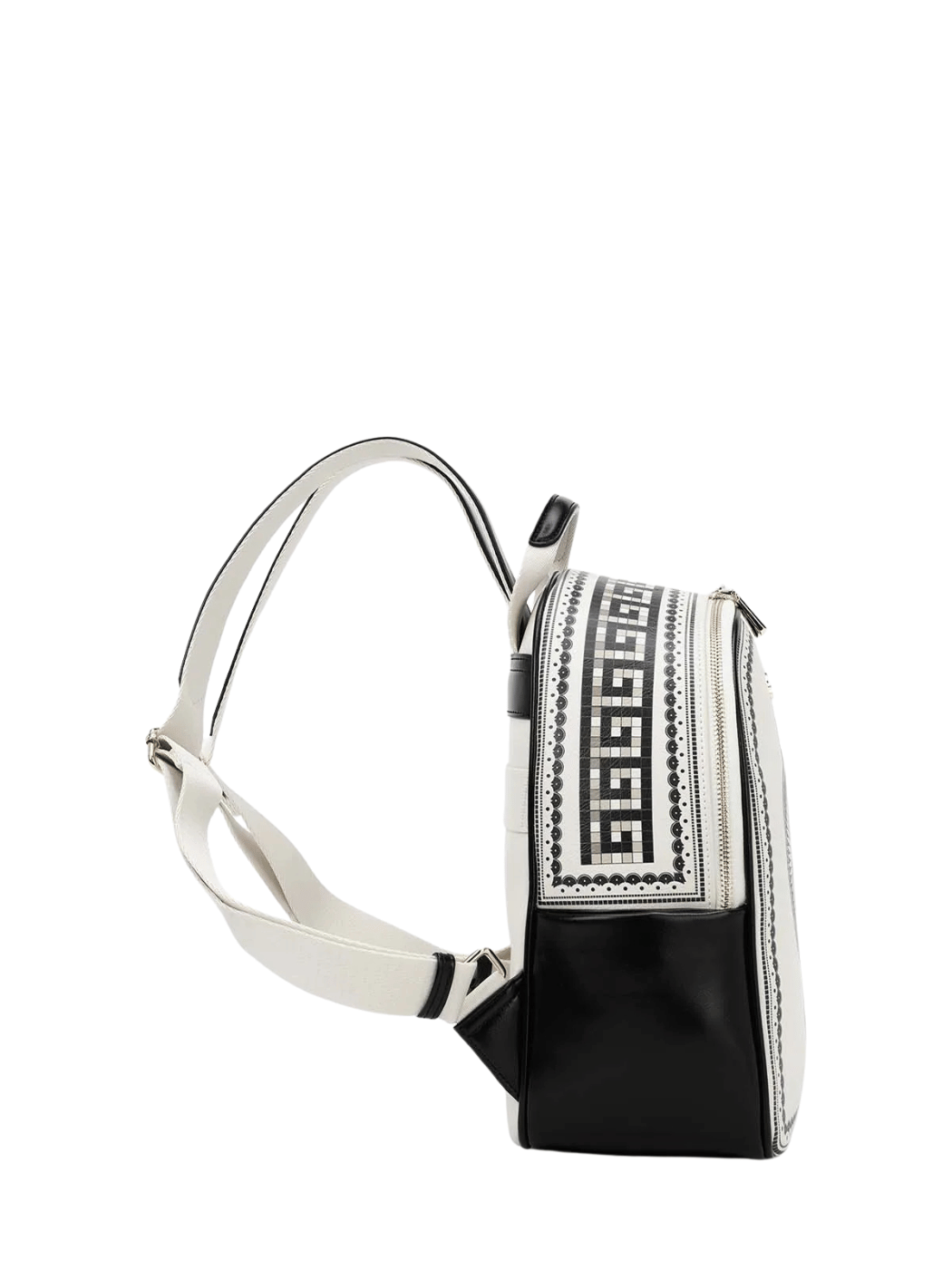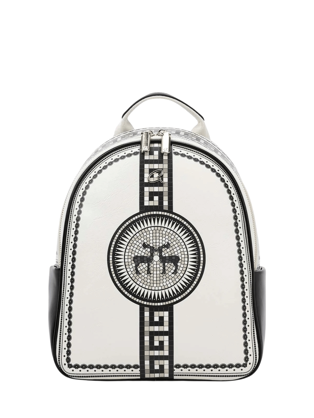 Γυναικείο σακίδιο πλάτης με μωσαϊκό τύπωμα ελάφι από υψηλής ποιότητας τεχνόδερμα. Διαθέτει πλαϊνές τσέπες, πίσω τσέπη και ιμάντα στερέωσης για βαλίτσα καθώς και χειρολαβή. Εσωτερικά περιέχει φόδρα, ανοιχτές θήκες και τσέπη που κλείνει. Κλείσιμο με διπλό φερμουάρ.
