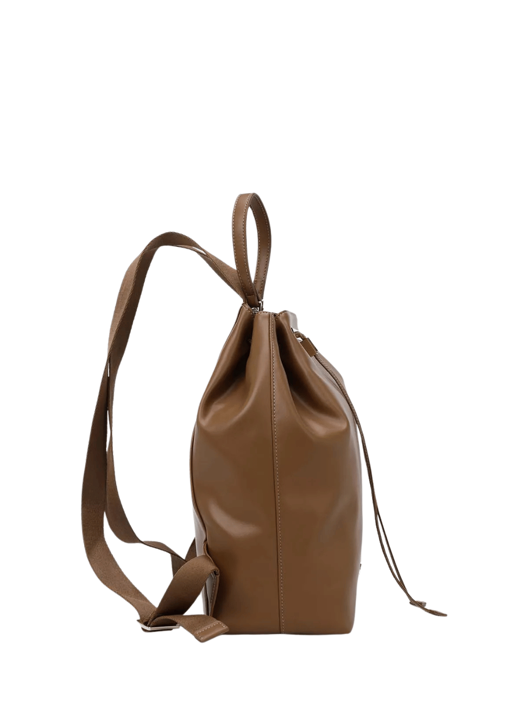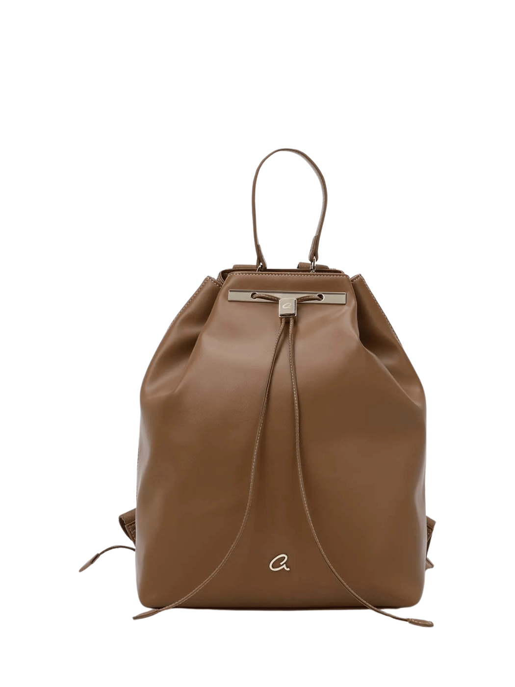 Γυναικείο σακίδιο πλάτης με χρυσές λεπτομέρειες από τεχνόδερμα. Εσωτερικά περιέχει φόδρα και τσέπη με φερμουάρ. Διαθέτει χειρολαβή και ρυθμιζόμενους ιμάντες πλάτης. Κλείνει με κορδόνια.