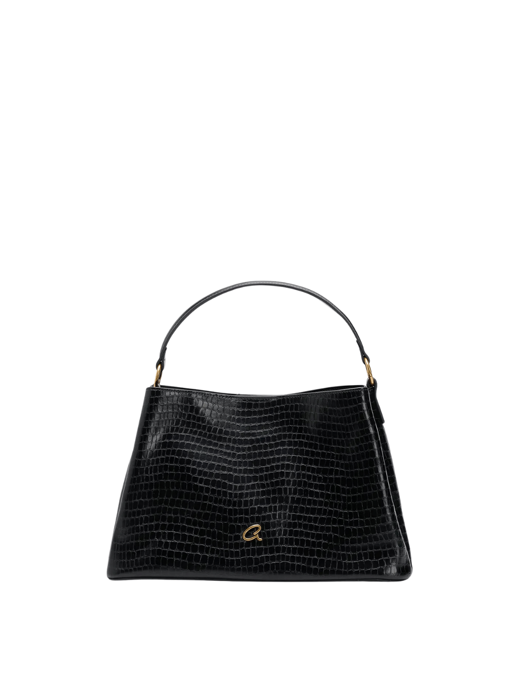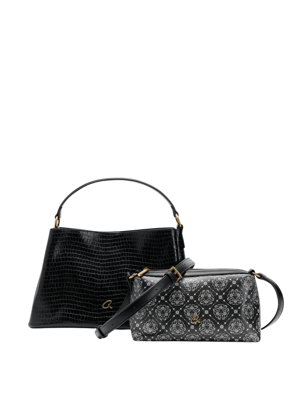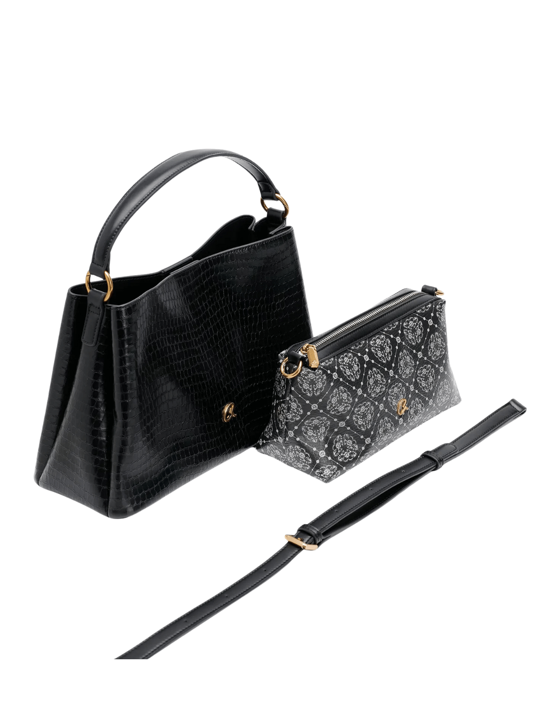 Γυναικεία τσάντα χειρός Avelina κατασκευασμένη από τεχνόδερμα με κροκό υφή. Εσωτερικά περιέχει μικρό αποσπώμενο τσαντάκι με φερμουάρ και τύπωμα πεταλούδα axel. Κλείνει με μαγνητικό κούμπωμα και διαθέτει έξτρα ρυθμιζόμενο λουράκι. Η εμφάνισή της τελειοποιείται με χρυσές χάλκινες λεπτομέρειες. Αποτελεί μία πολύ ξεχωριστή τσάντα η οποία μπορεί να κρατηθεί με τρεις διαφορετικούς τρόπους : σαν χειρός, ως χιαστί ή ως χιαστί με το εσωτερικό τσαντάκι της.