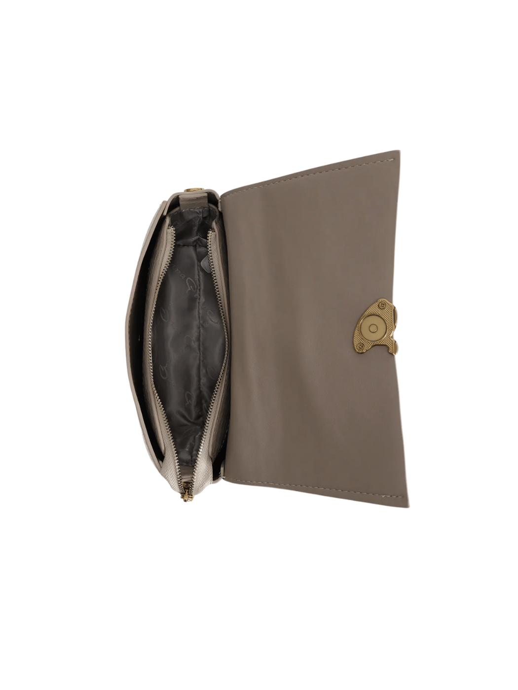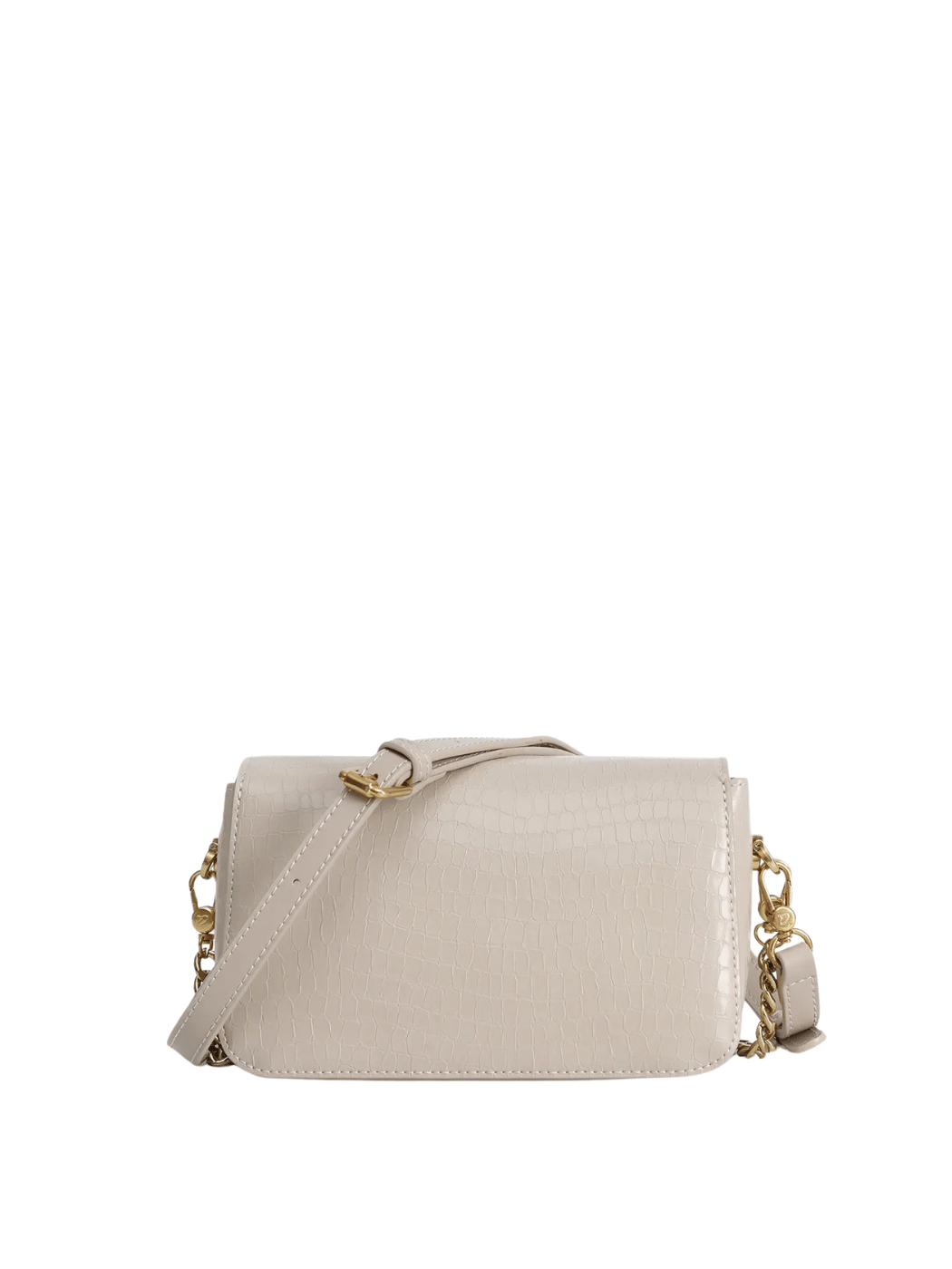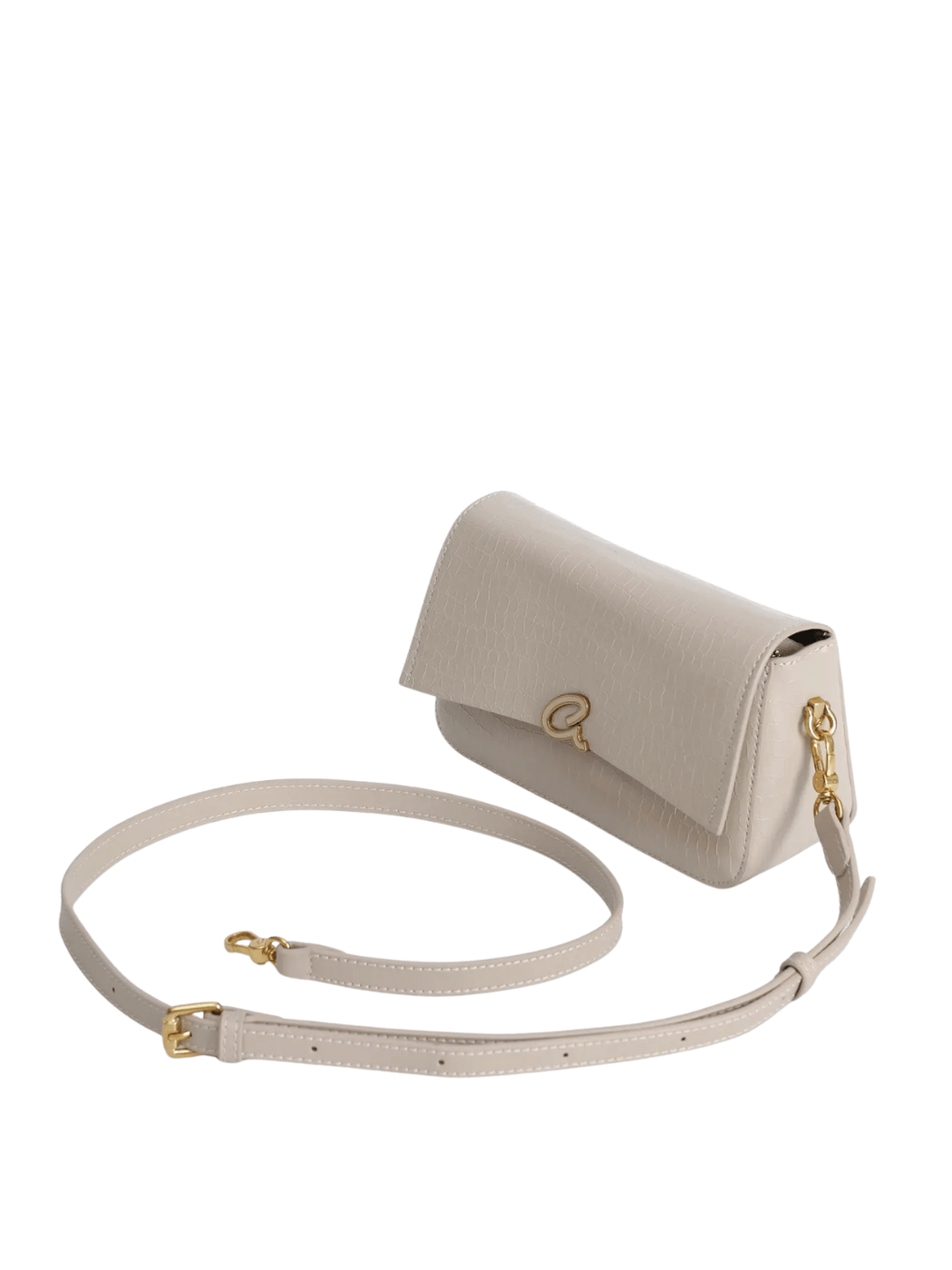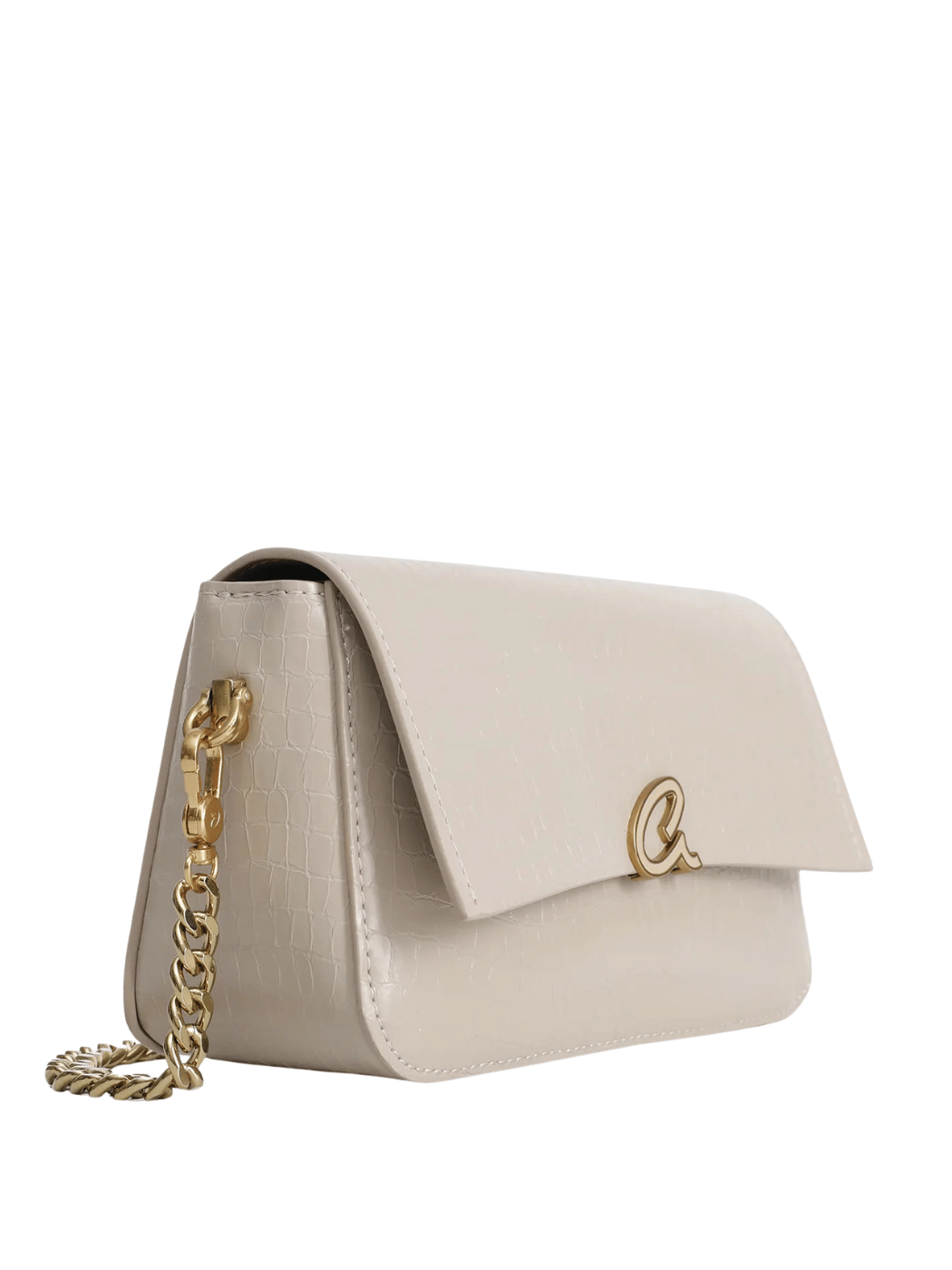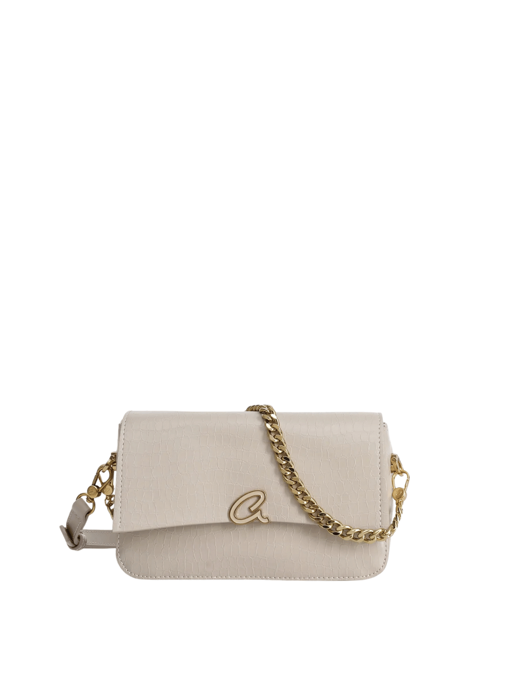 Γυναικεία τσάντα μικρή Avelina από τεχνόδερμα με κροκό υφή. Μπορεί να φορεθεί ως χιαστί από το λουράκι της ή στον ώμο με τη χρυση αλυσίδα που διαθέτει. Ασφαλίζει με καπάκι και χρυσό μαγνητικό κούμπωμα σε σχήμα ‘a’. Εσωτερικά διαχωρίζεται σε τρία τμήματα, περιέχει τσέπη και θήκη με φερμουάρ ενώ είναι πλήρως επενδυμένη με φόδρα. Ένα τσαντάκι που μπορεί να συνδυαστεί εύκολα με πρωινά ή και βραδινά σύνολα.