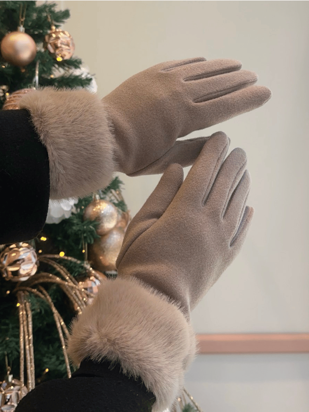 Κομψά γυναικεία υφασμάτινα γάντια με διακριτική γούνα στον καρπό και λεπτή χρυσή λεπτομέρεια για luxury εμφάνιση. Κατάλληλα για χρήση οθόνης αφής, ιδανικά για καθημερινή κομψότητα.
