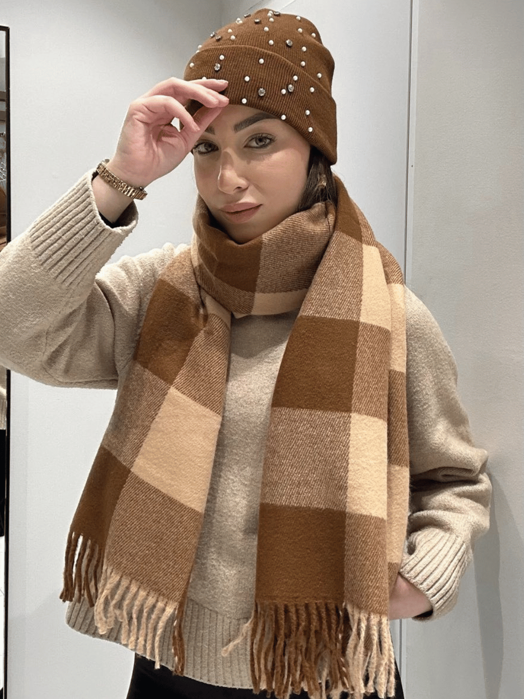 Κομψό μπεζ καρό κασκόλ με κρόσσια, ιδανικό για ζεστές και διαχρονικές χειμερινές εμφανίσεις. Συνδυάζεται εύκολα με κάθε outfit.
