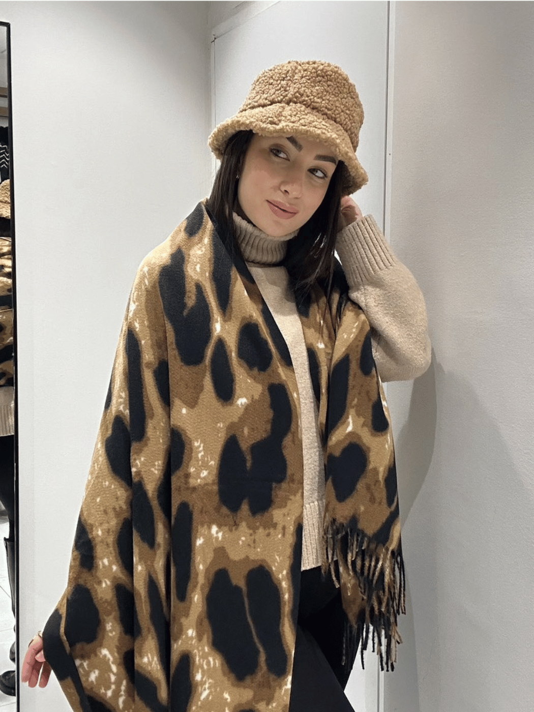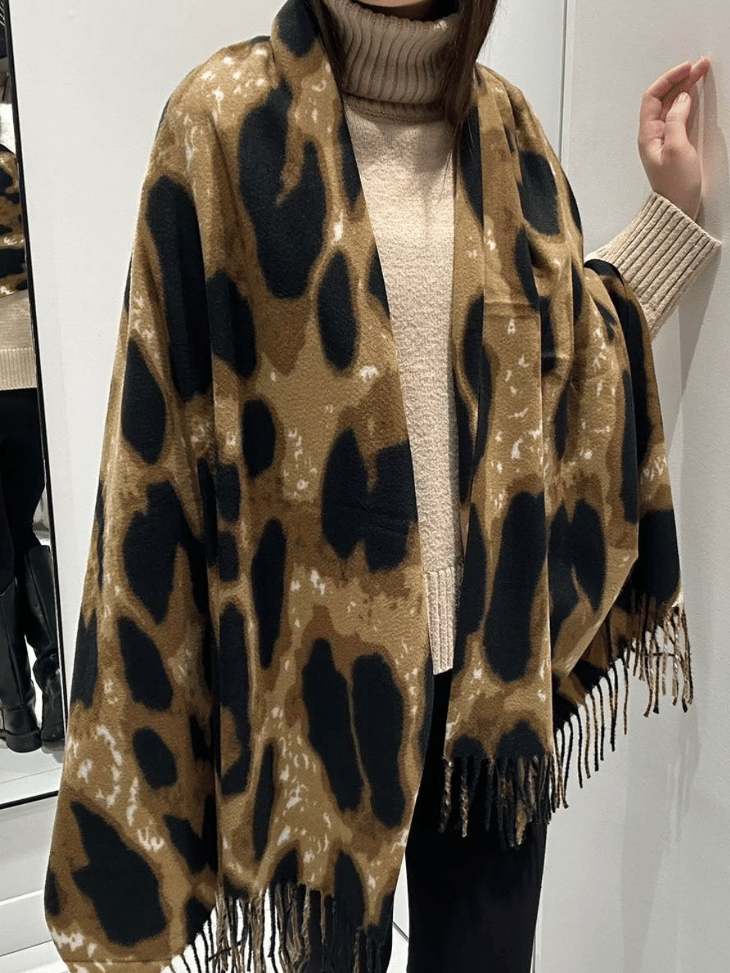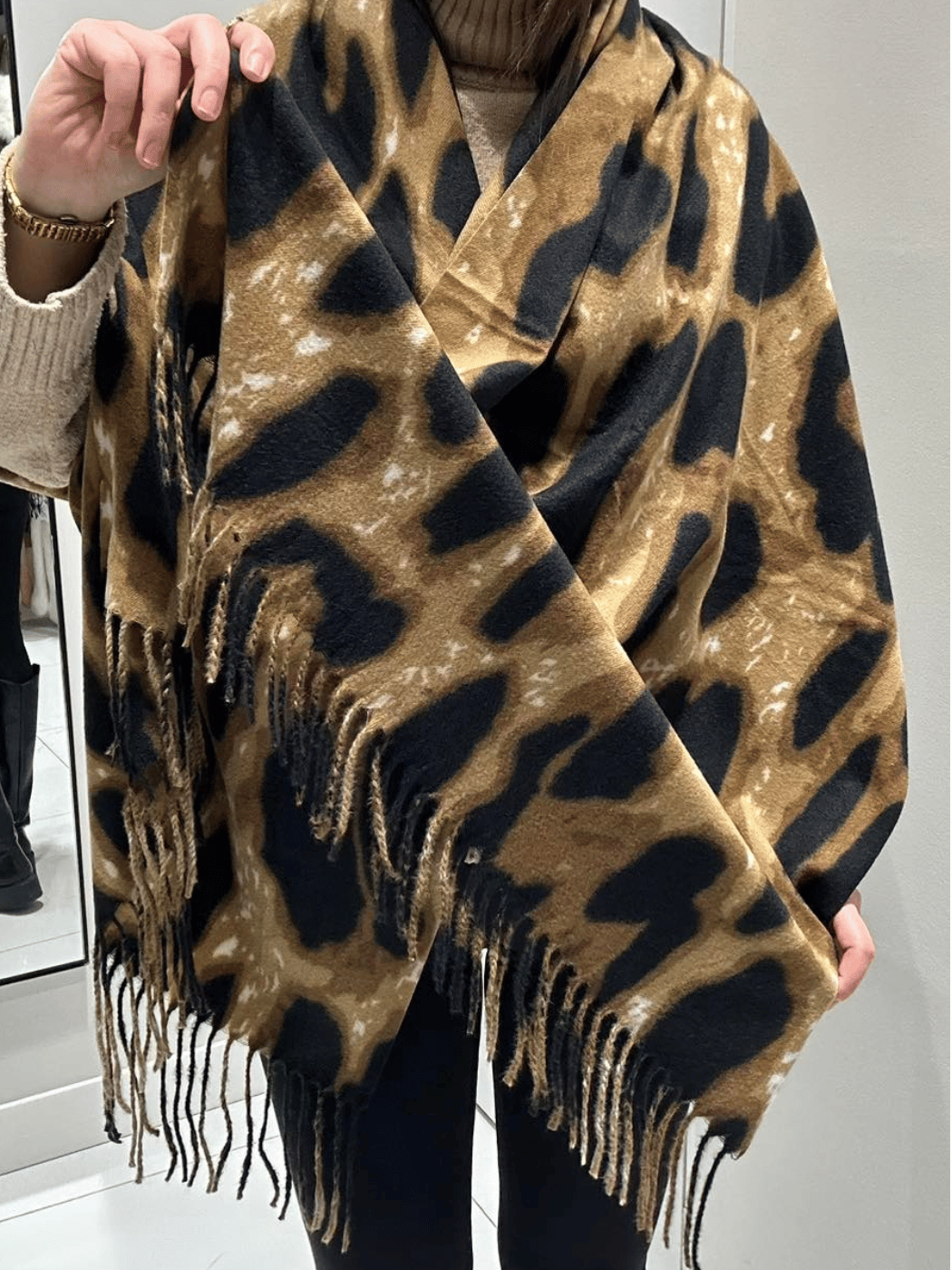 ομψό λεοπάρ κασκόλ σε ζεστούς καφέ τόνους, με απαλή υφή και κρόσσια. Ιδανικό για στυλάτες εμφανίσεις κάθε στιγμή της ημέρας.