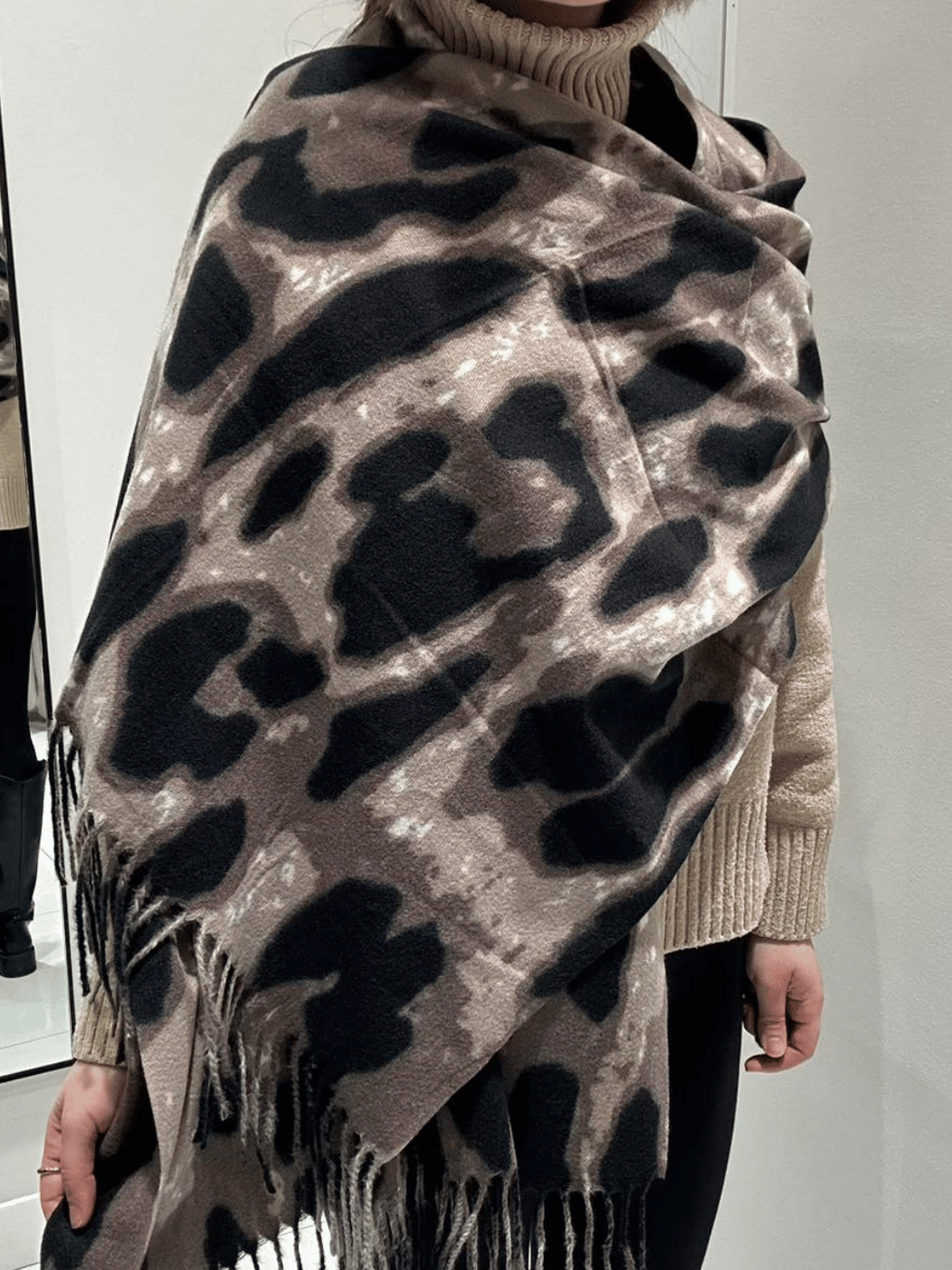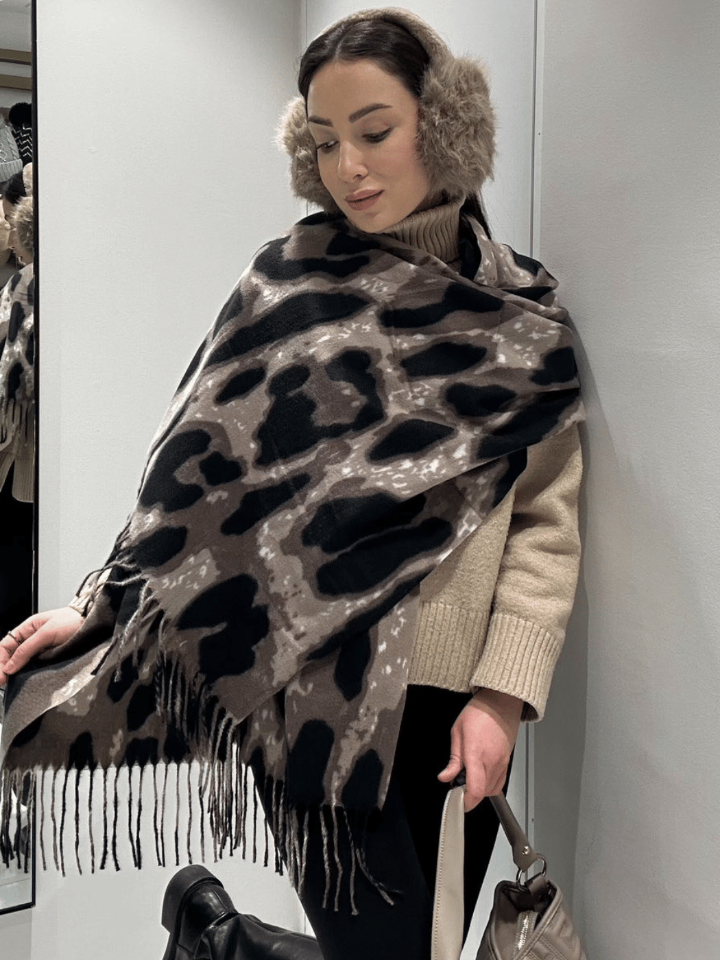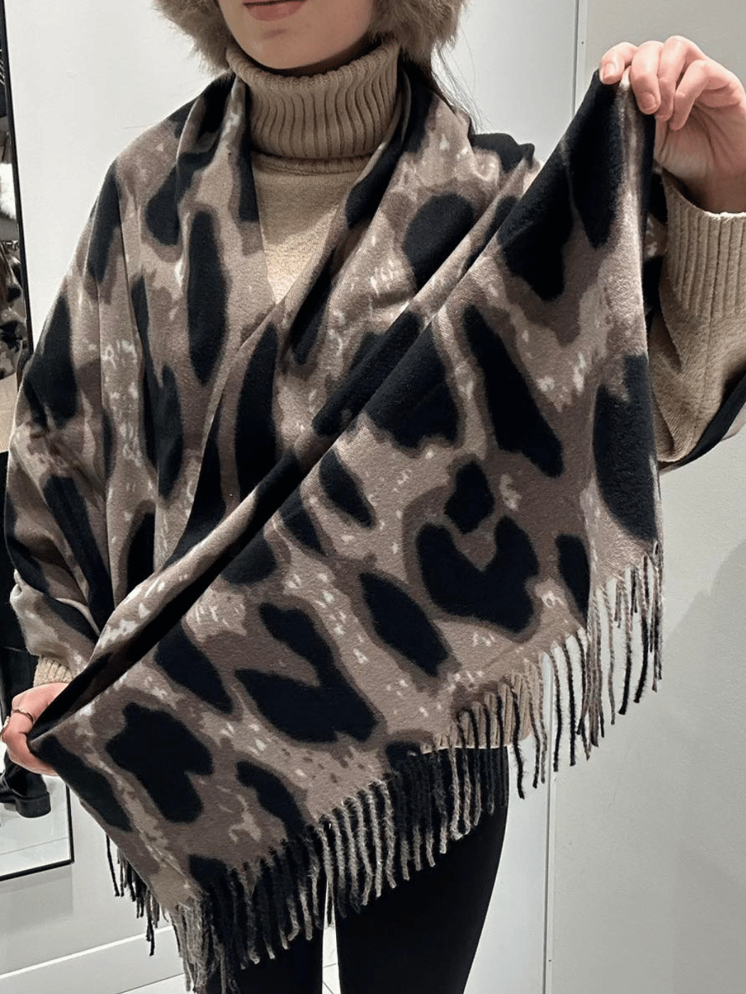 Κομψό και απαλό λεοπάρ κασκόλ σε μπεζ τόνους, με διακριτικά κρόσσια. Ιδανικό για καθημερινές αλλά και πιο chic εμφανίσεις.