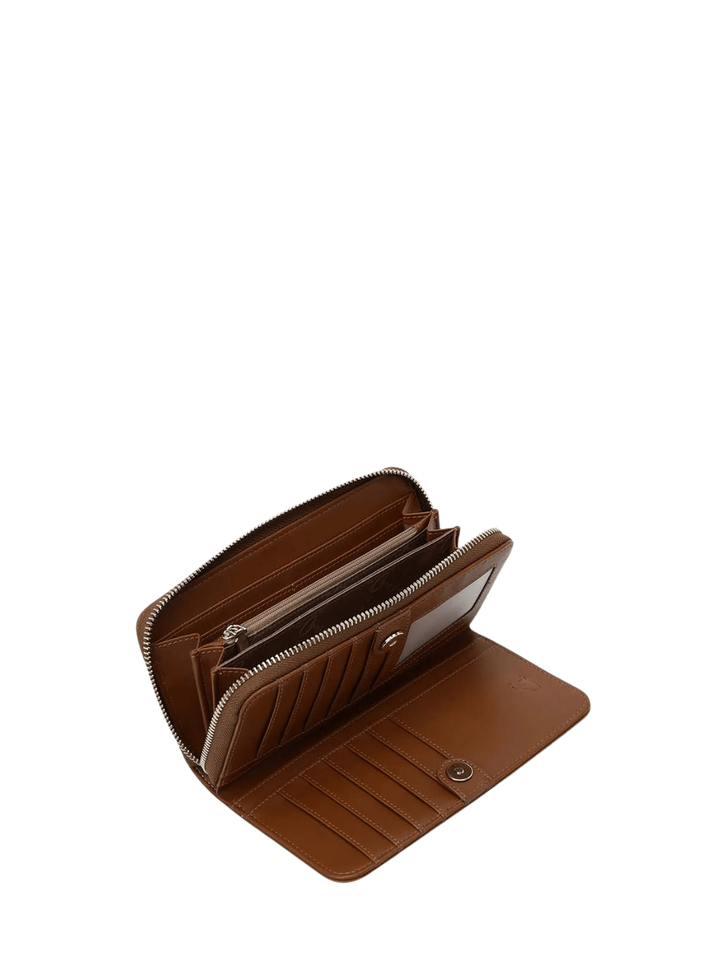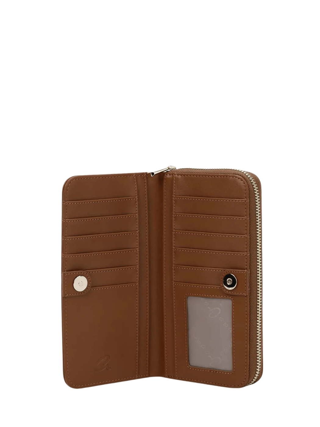 Γυναικείο πορτοφόλι με λεία υφή, από τεχνόδερμα. Διαχωρίζεται σε δύο τμήματα: το ένα ασφαλίζει με φερμουάρ για νομίσματα και το άλλο ασφαλίζει με μεταλλικό κούμπωμα και περιλαμβάνει χώρους για κάρτες και πλαϊνή θέση για χαρτονομίσματα.