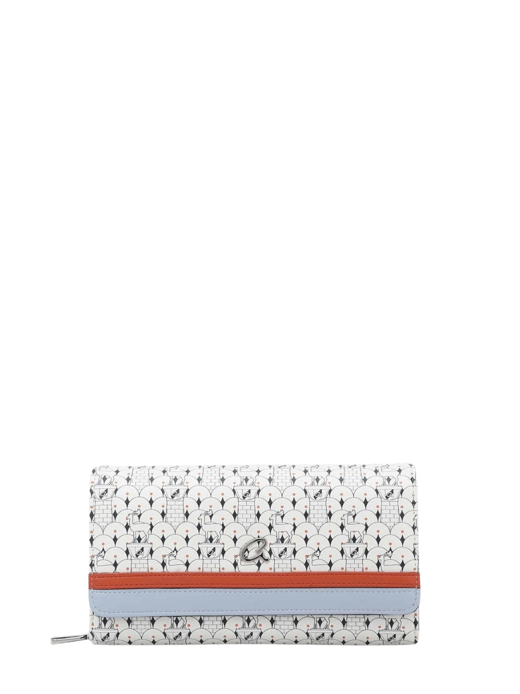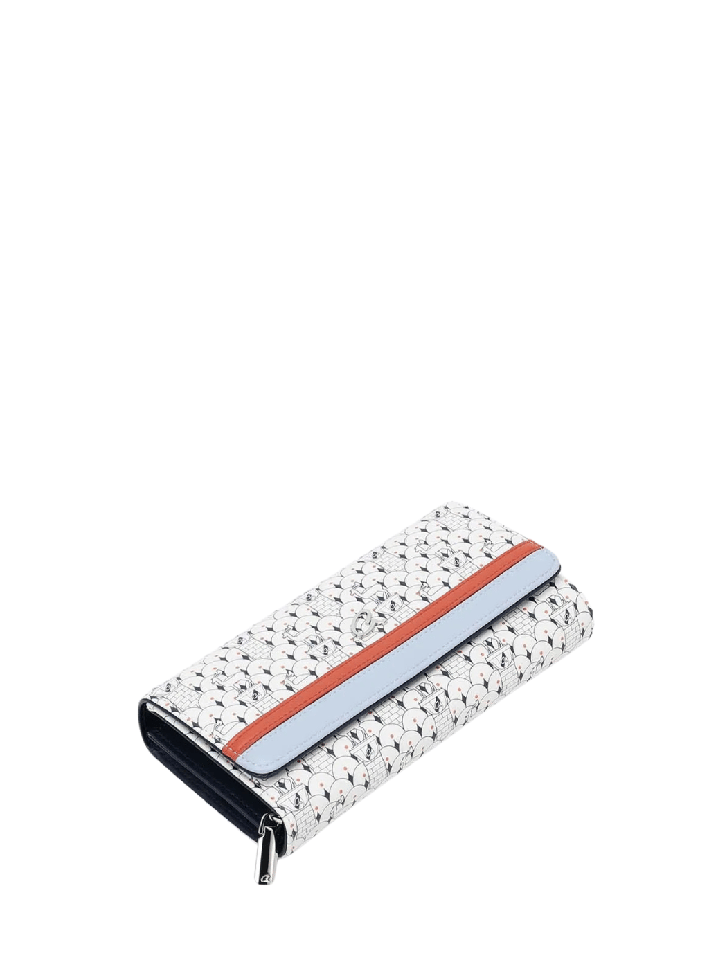 Γυναικείο πορτοφόλι με μωσαϊκό τύπωμα, από τεχνόδερμα. Με θήκες καρτών, εσωτερική θήκη φερμουάρ και θέση για χαρτονομίσματα. Κλείνει με καπάκι και κούμπωμα. Ιδανικός συνδυασμός για το σακίδιο 1023-0616.