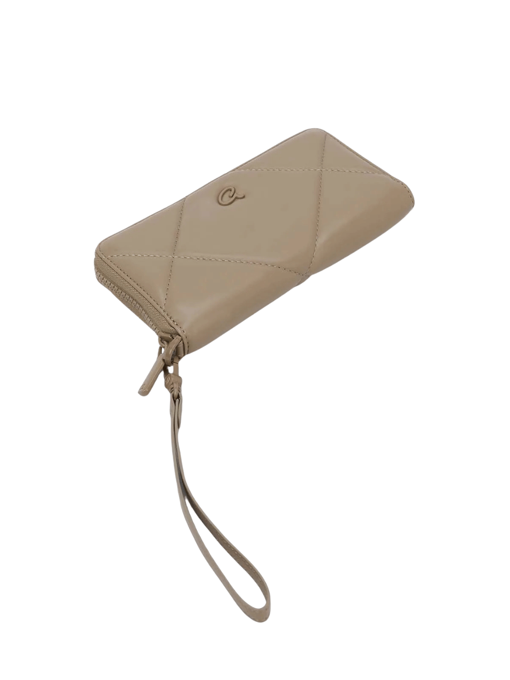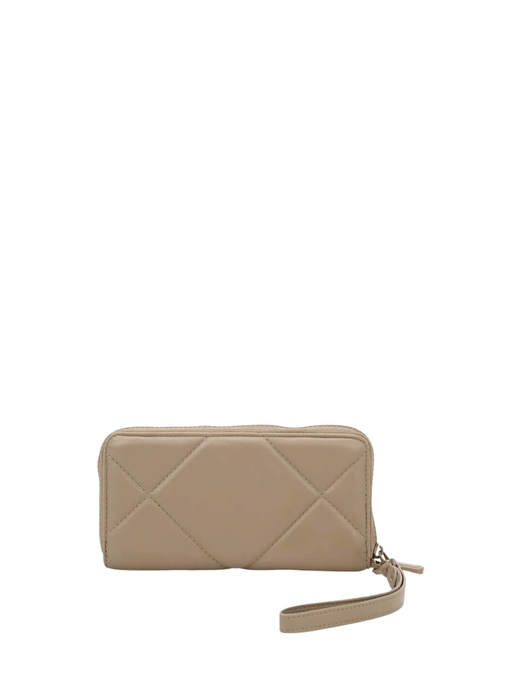Γυναικείο πορτοφόλι καπιτονέ, με γαζιά, από τεχνόδερμα υψηλής ποιότητας. Περιέχει κεντρική θήκη με φερμουάρ και θέσεις για κάρτες και χαρτονομίσματα. Διαθέτει αποσπώμενο μικρό λουράκι και κλείνει με φερμουάρ.