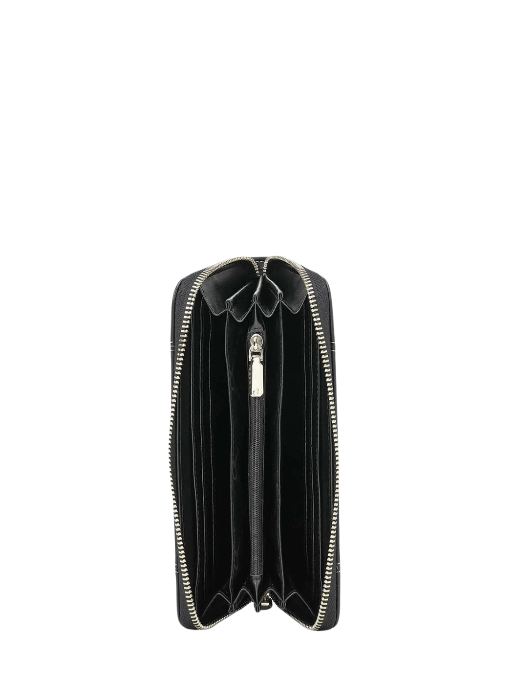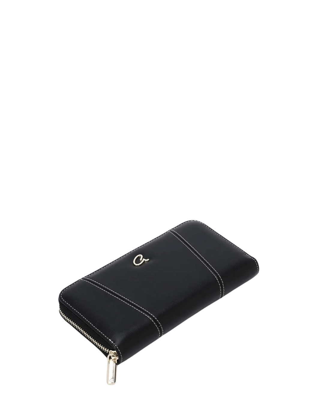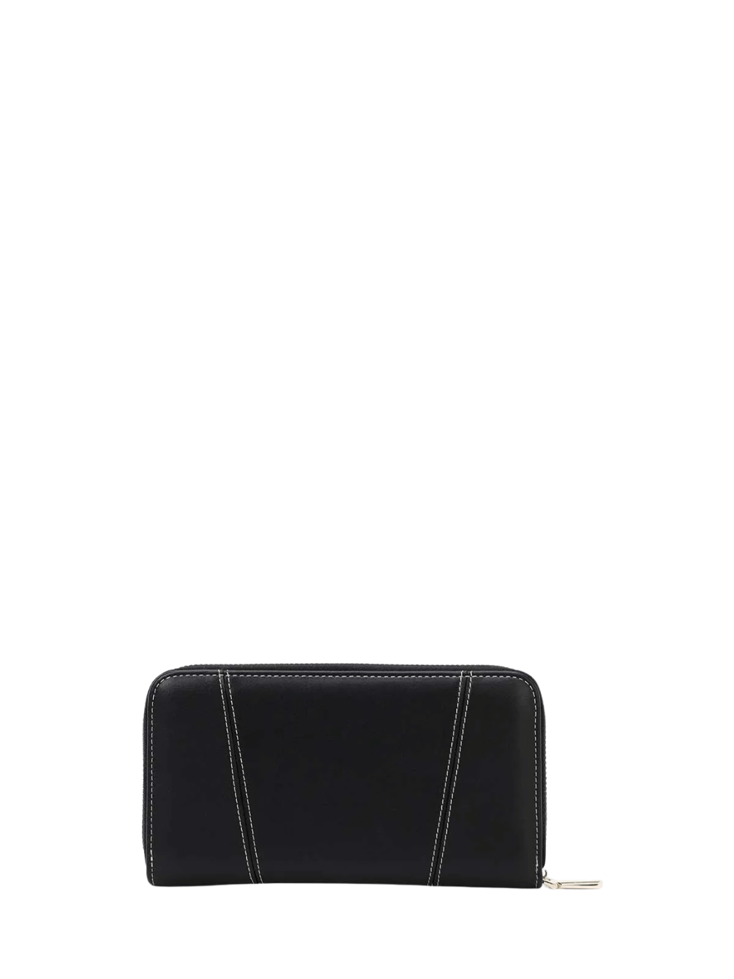 Γυναικείο πορτοφόλι με ραφές από τεχνόδερμα. Διαθέτει θήκη φερμουάρ για νομίσματα, θήκες χαρτονομισμάτων και πολλαπλές θέσεις για κάρτες. Ασφαλίζει με φερμουάρ. Ένα κλασικό πορτοφόλι, ιδανικό για κάθε τσάντα.