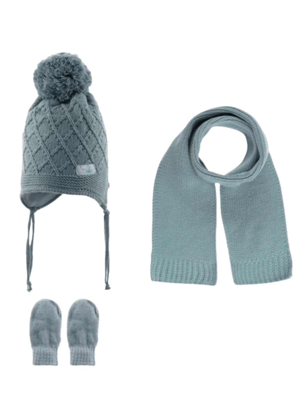 Παιδικό χειμερινό σετ 3 τεμαχίων, πλεκτό με εσωτερική fleece επένδυση και φουντίτσα σε mint χρώμα για αγόρι. Ιδανικά για την προστασία του παιδιού από το κρύο. Το σετ περιλαμβάνει σκουφάκι-γάντια-κασκόλ.
