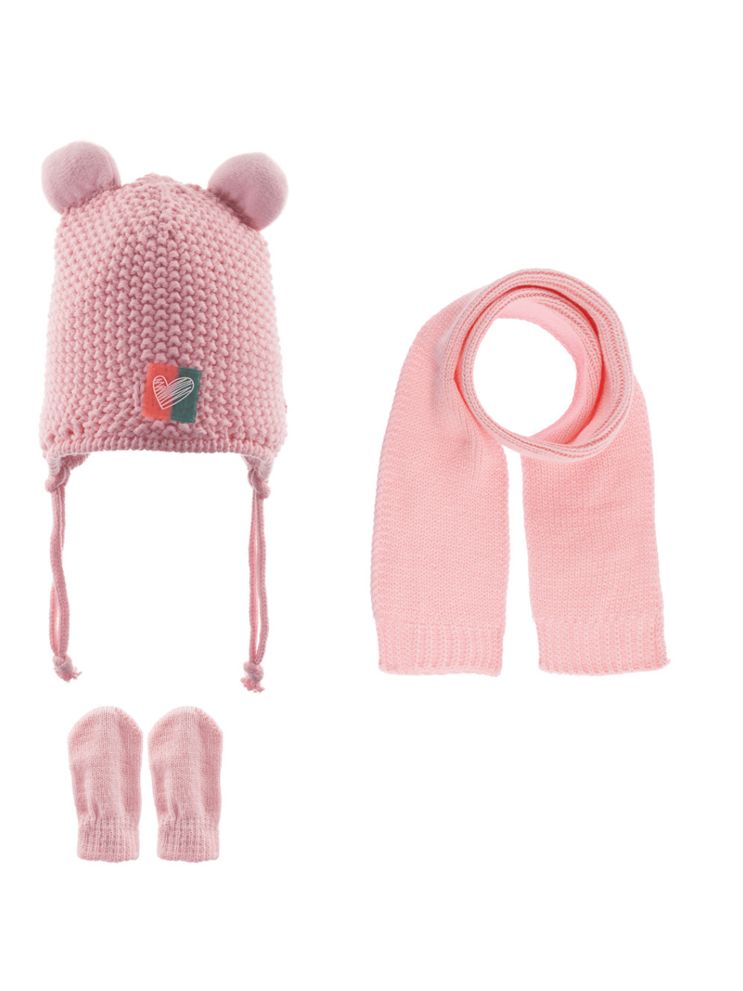 Παιδικό χειμερινό σετ 3 τεμαχίων, πλεκτό με εσωτερική fleece επένδυση και δυο φουντίτσες σε ροζ χρώμα. Ιδανικά για την προστασία του παιδιού από το κρύο. Το σετ περιλαμβάνει σκουφάκι-γάντια-κασκόλ.
