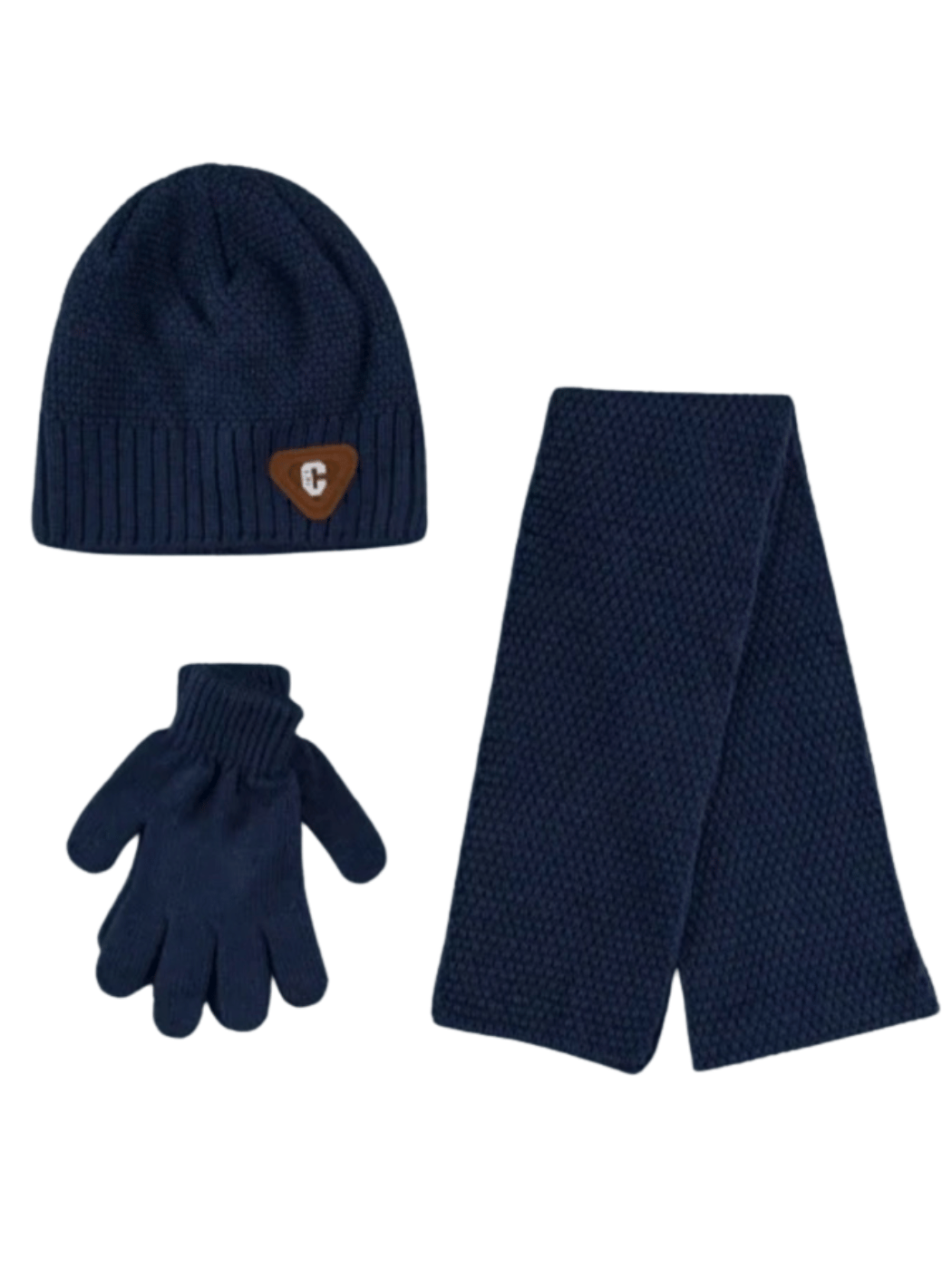 Παιδικό χειμερινό σετ 3 τεμαχίων, πλεκτό με εσωτερική fleece επένδυση σε σκούρο μπλε χρώμα για αγόρι. Ιδανικά για την προστασία του παιδιού από το κρύο. Το σετ περιλαμβάνει σκουφάκι-γάντια-κασκόλ.