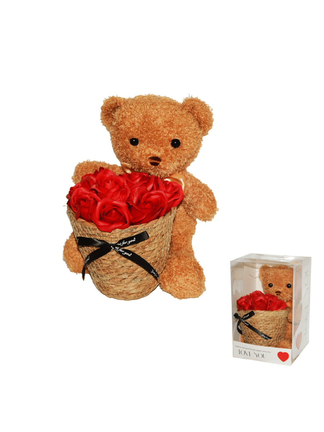 Αρκουδάκι με Καλάθι Κόκκινων Λουλουδιών Σαπουνιού 27×17×17cm
