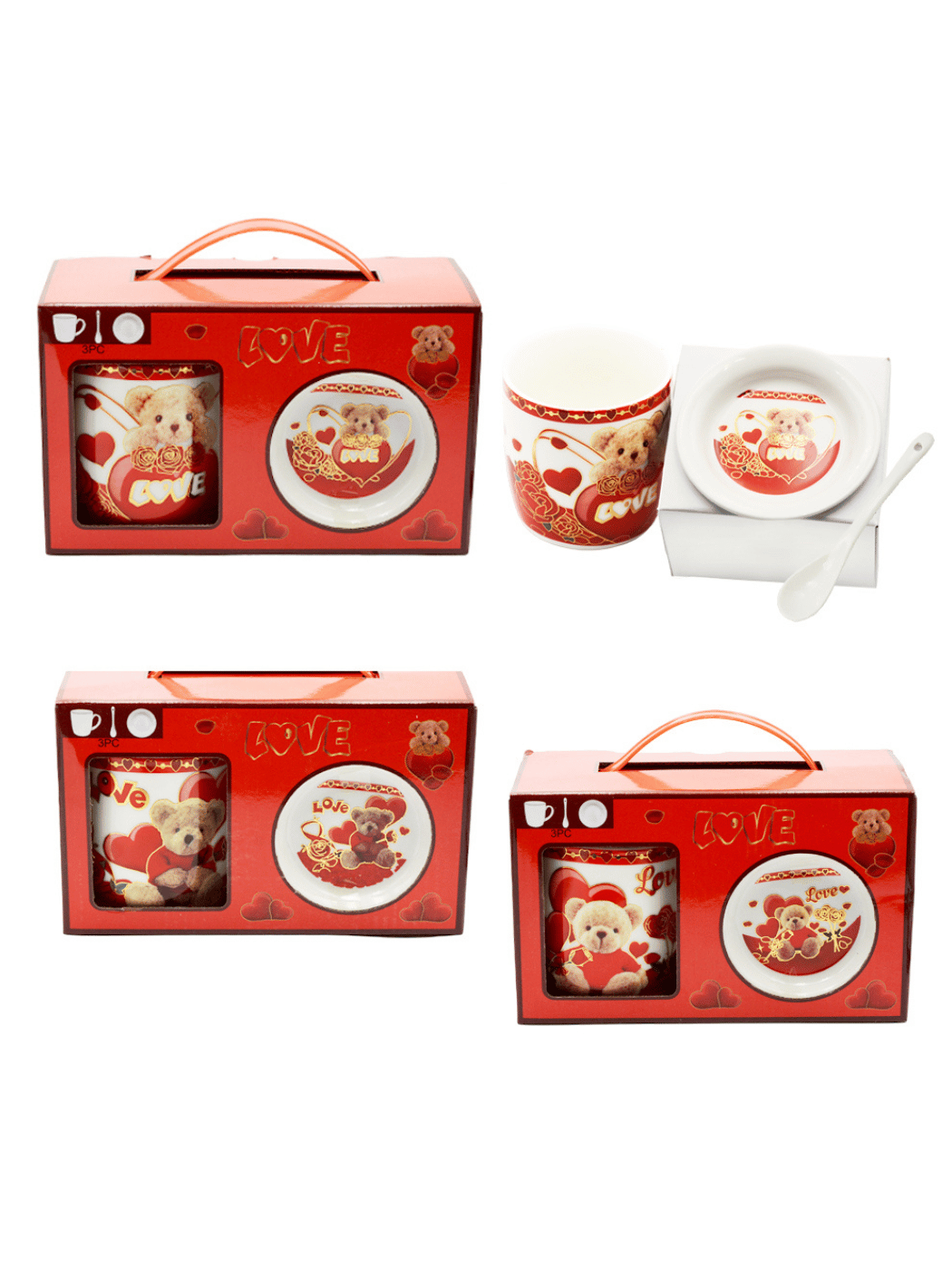 Κομψό σετ δώρου “Love” με κεραμική κούπα, πιατάκι και κουταλάκι – ιδανικό για αγαπημένα πρόσωπα.