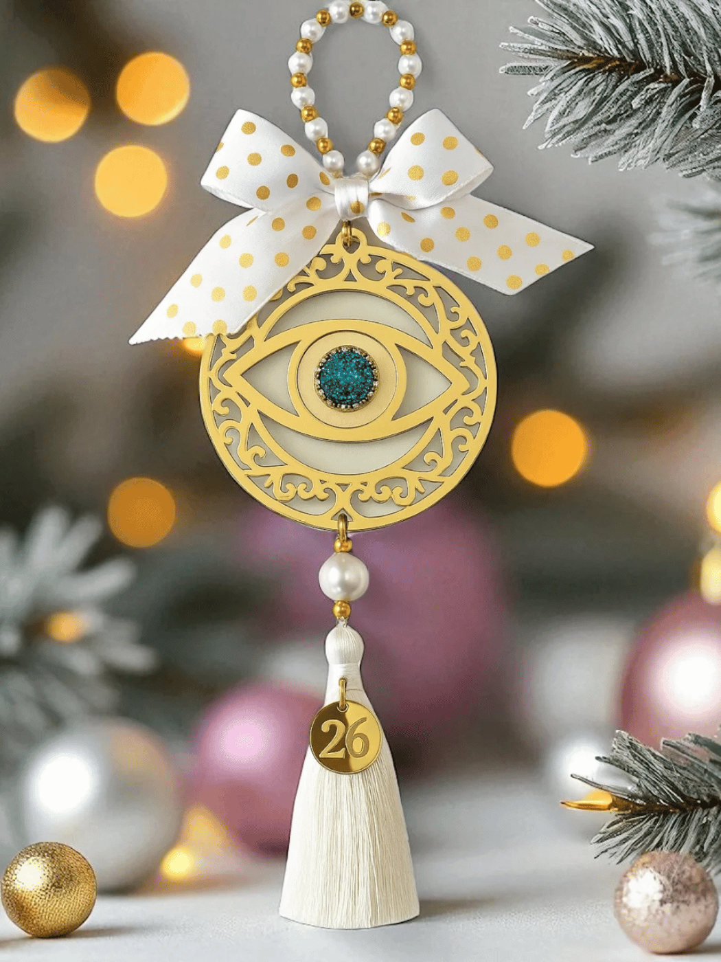 Το μοτίφ μάτι στο κέντρο συμβολίζει την προστασία και τη θετική ενέργεια, ενώ το charm 26 και η πλούσια φούντα ολοκληρώνουν το glamorous αποτέλεσμα.